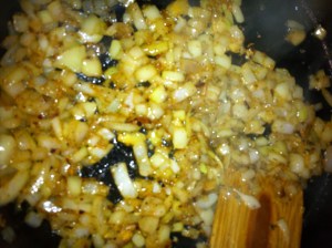 *Chop onion finely. If you are using raw garlic (about 2 cloves) mince finely. If using roasted garlic cloves because the flavor is more mild, go ahead and mash about 4-5 cloves.