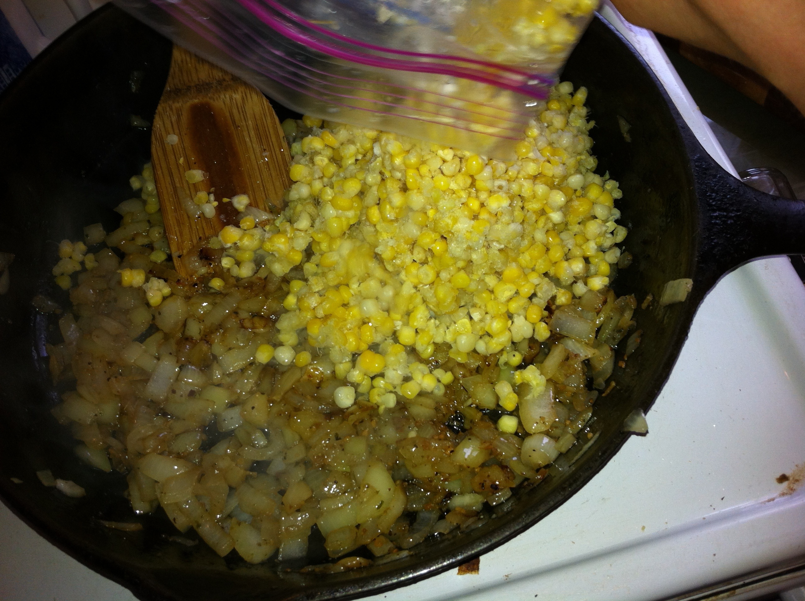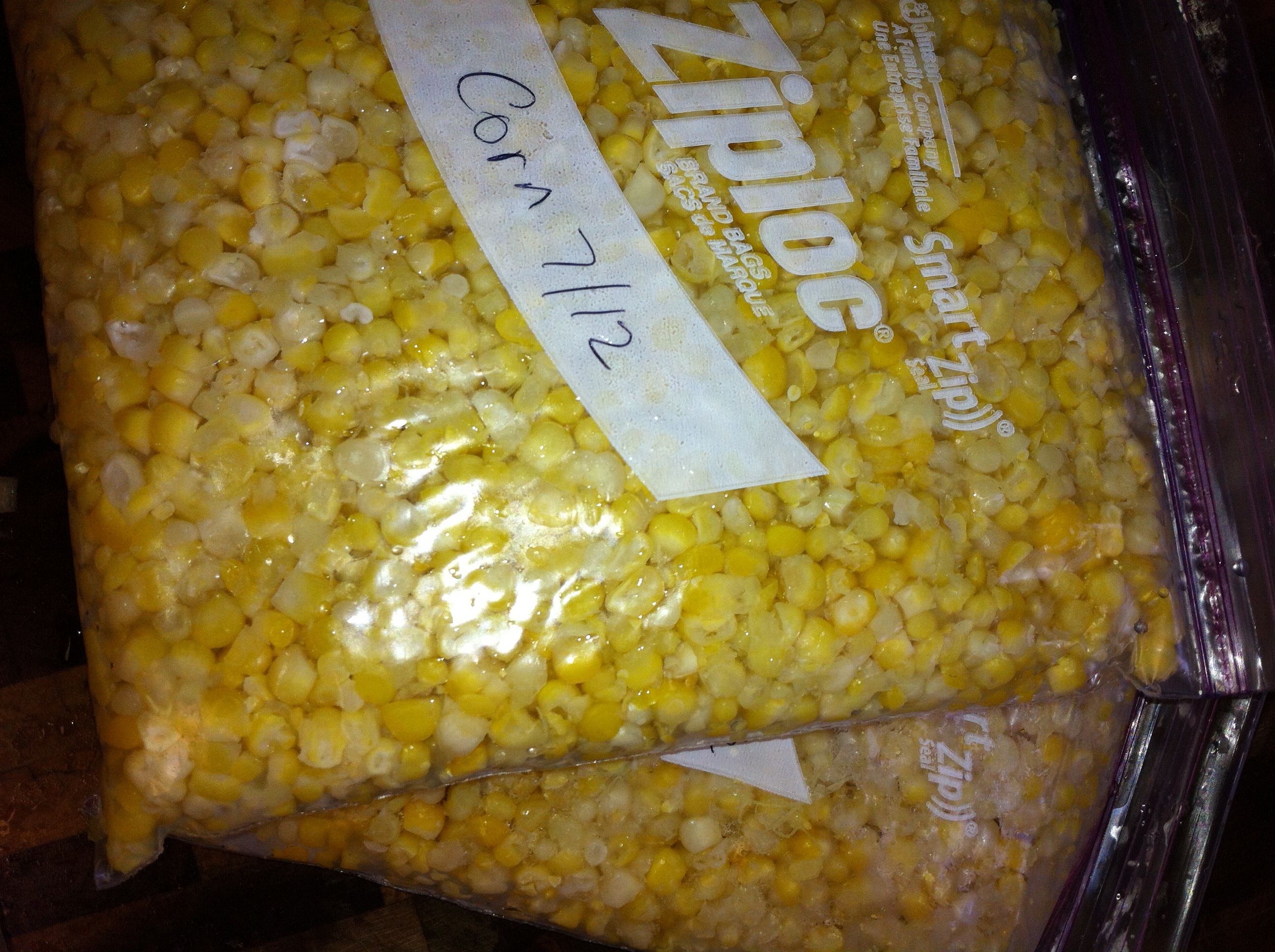*Pour frozen corn into skillet and mix until combined. Cook a few minutes to heat corn through, stirring as necessary. This is corn that we froze from the garden this summer. I think that a 12 oz frozen package from the store ends up being about the same amount as one of these packages.