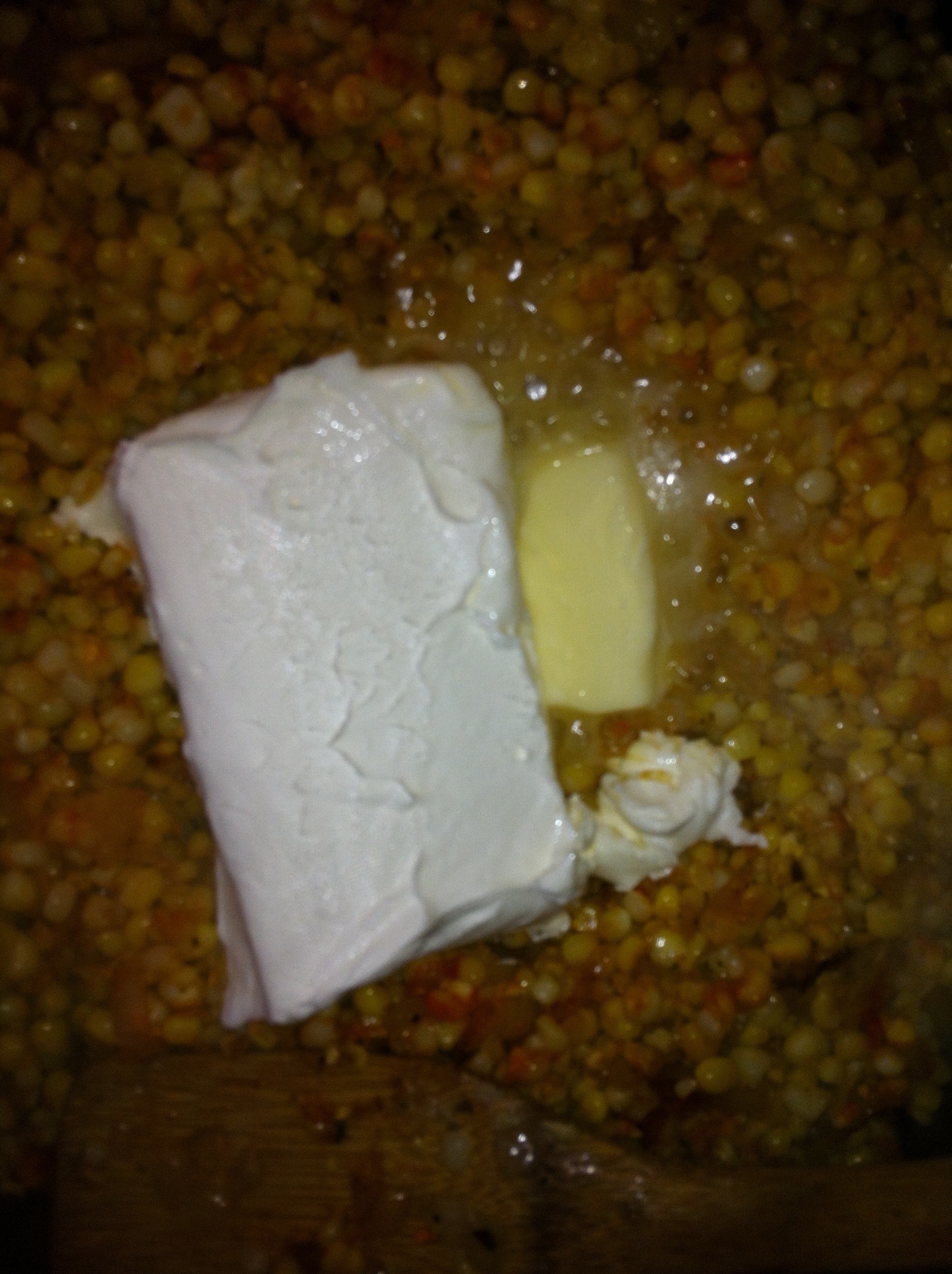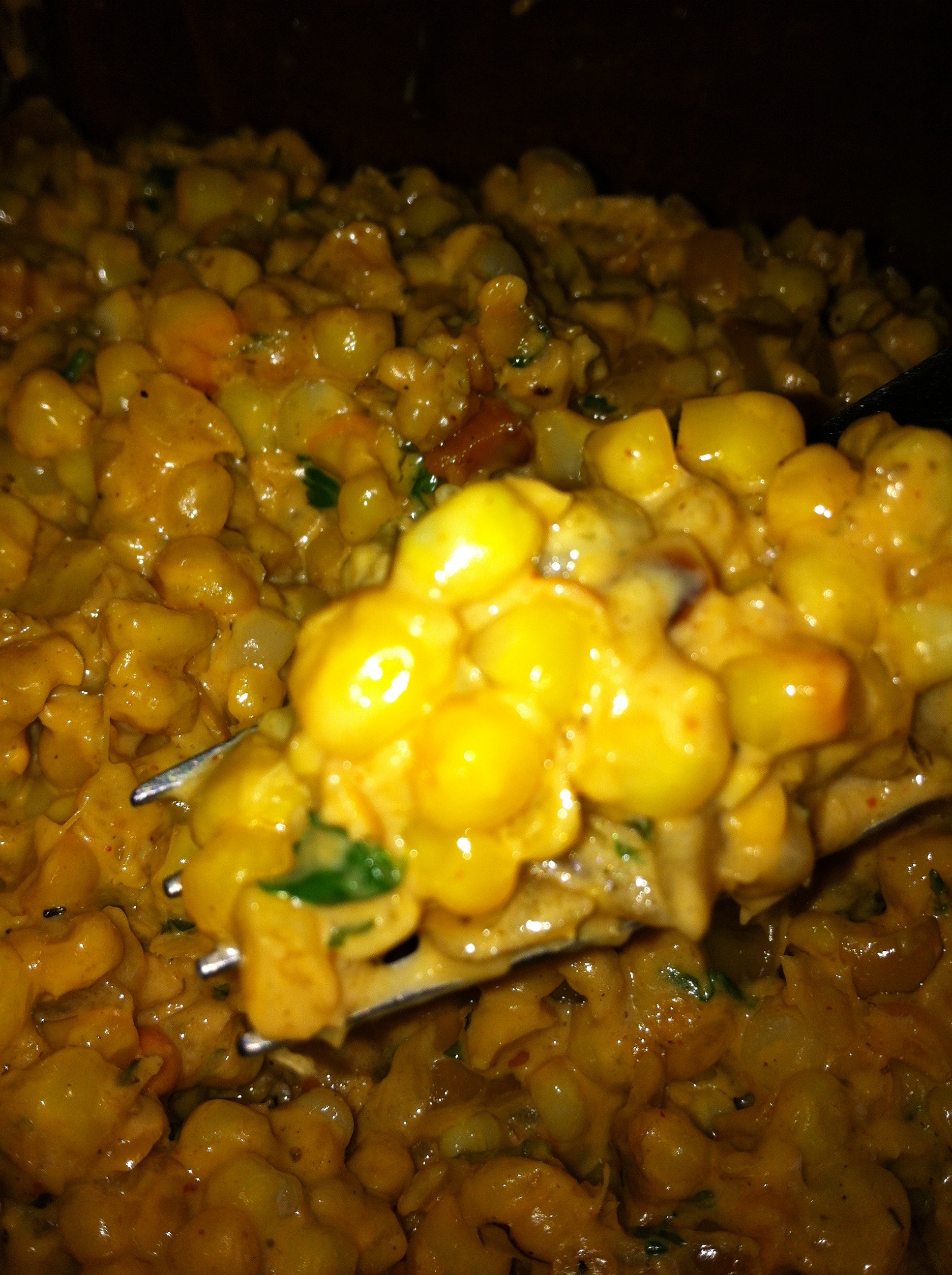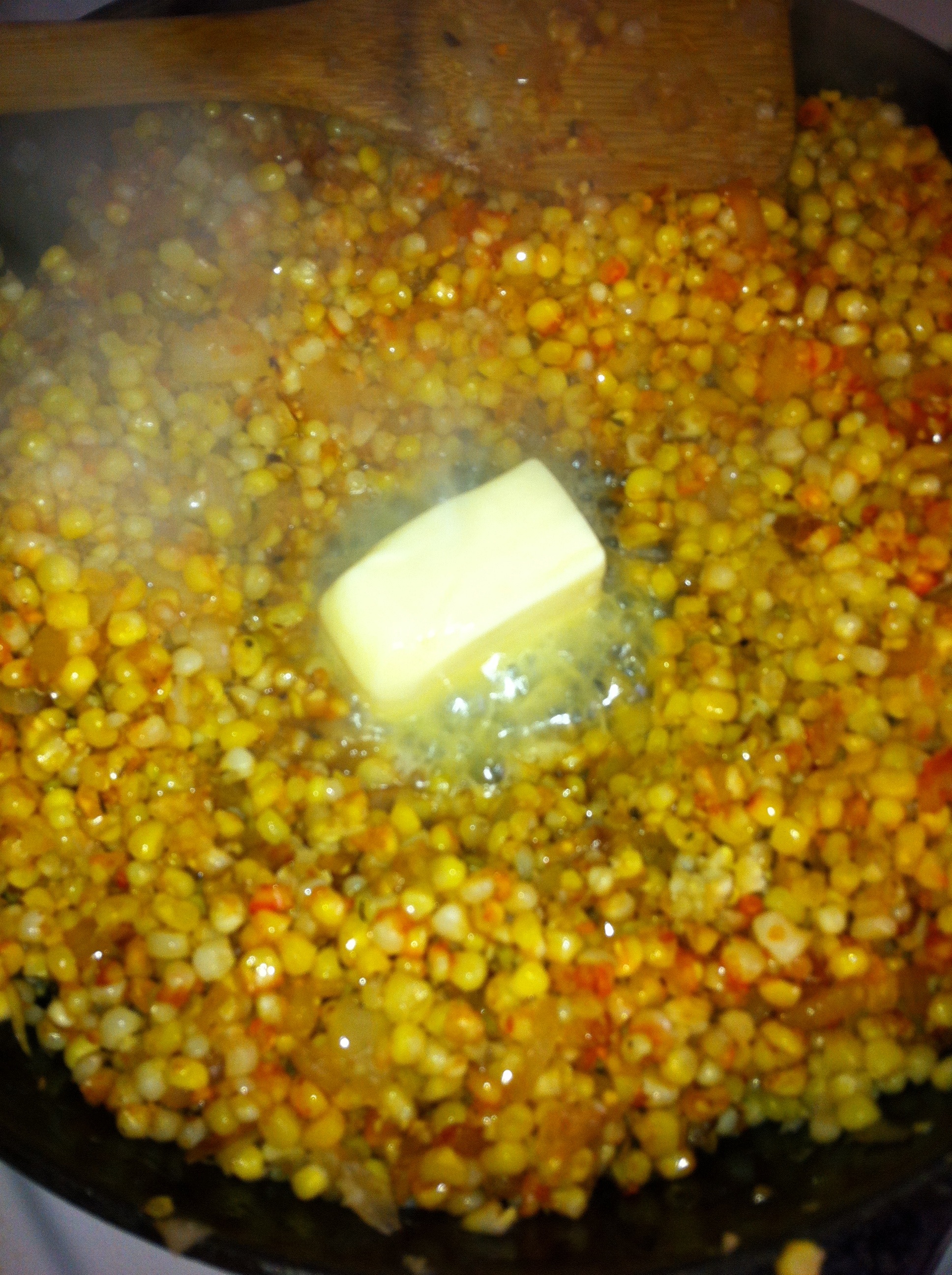 *Make a “well” in the center of the corn mixture and add the butter and cream cheese. Allow to melt a little bit and mix into corn mixture. Continue to mix until cream cheese and butter is completely melted. Turn temperature to a medium-low setting.