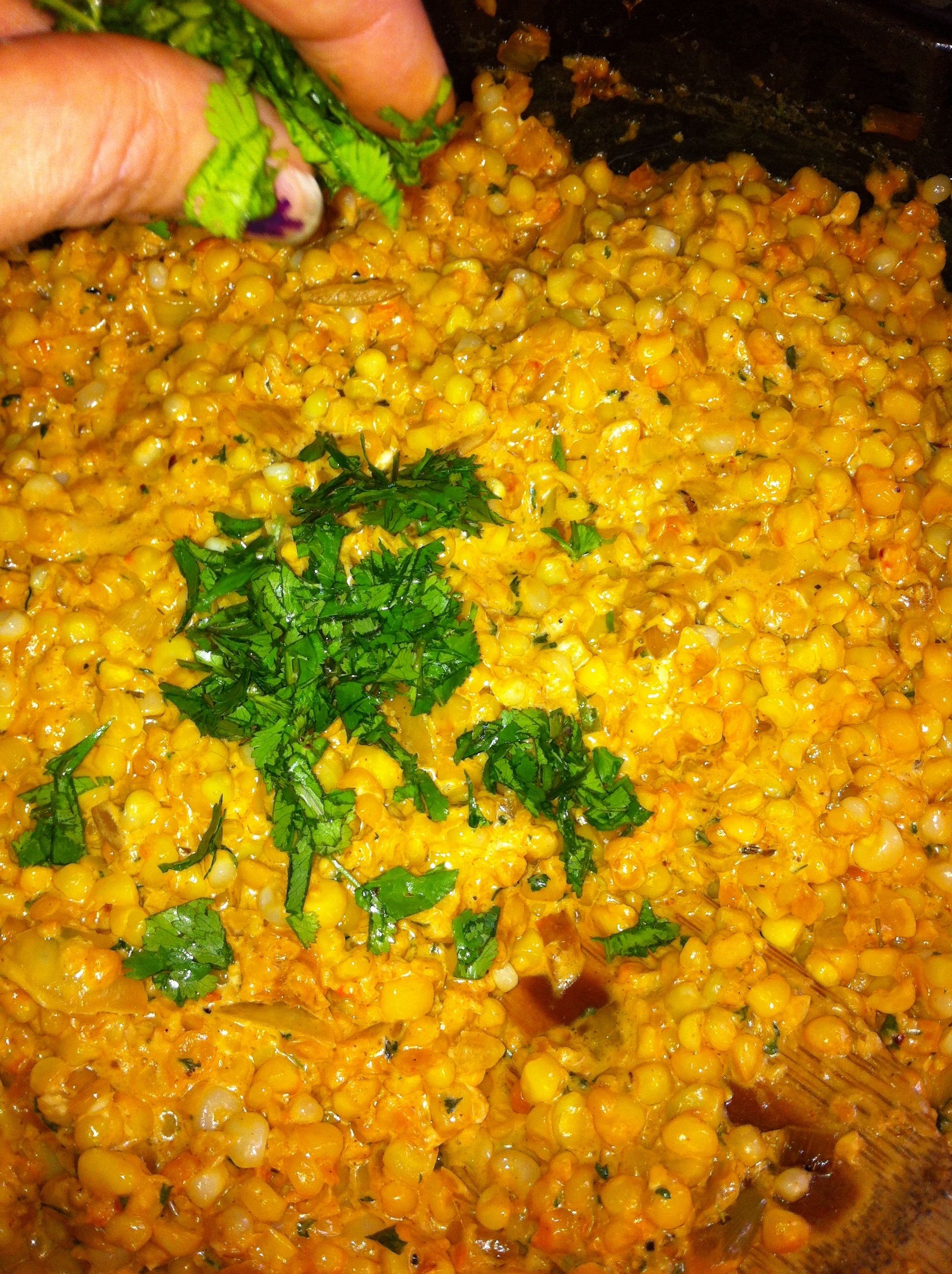 *For even more color, flavor and added “freshness” add a little bit of chopped cilantro. If you have to run down to the garden across the road to see if any cilantro has survived the past couple weeks of freezes feel free to do that. If you happen to find some, like I did, grab a handful, rinse it off and chop some up and throw it in. Or, you could just buy a bunch at the store…it might be easier! 😉