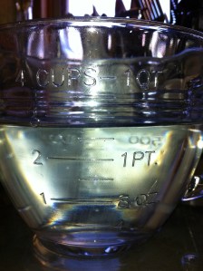 *Measure out shortening. You can certainly use your 1/3 c dry measuring cup and fill ‘er up twice {or 2/3 cup if you happen to have one in your set}, but it makes a big sticky mess to clean up afterward. I learned a trick a long time ago in a cooking class that makes the clean up of the utensils a little bit easier. Fill up a liquid measuring cup with cold water. Let’s say you have a 2 cup measuring cup. Fill it up to the 1 1/3 cup mark with the cold water. Now take a spoon and add shortening a little bit at a time, totally submerging under the water, until the water line raises to the 2 cup mark. I know, using your math skills. Maybe I’m expecting too much, but I believe in you! 1 1/3 c of water + 2/3 c of shortening does add up to 2 cups total! Since water and oil don’t mix, just pick up the shortening, shake off the water and use. The clean up of your liquid measuring cup should be a cinch!