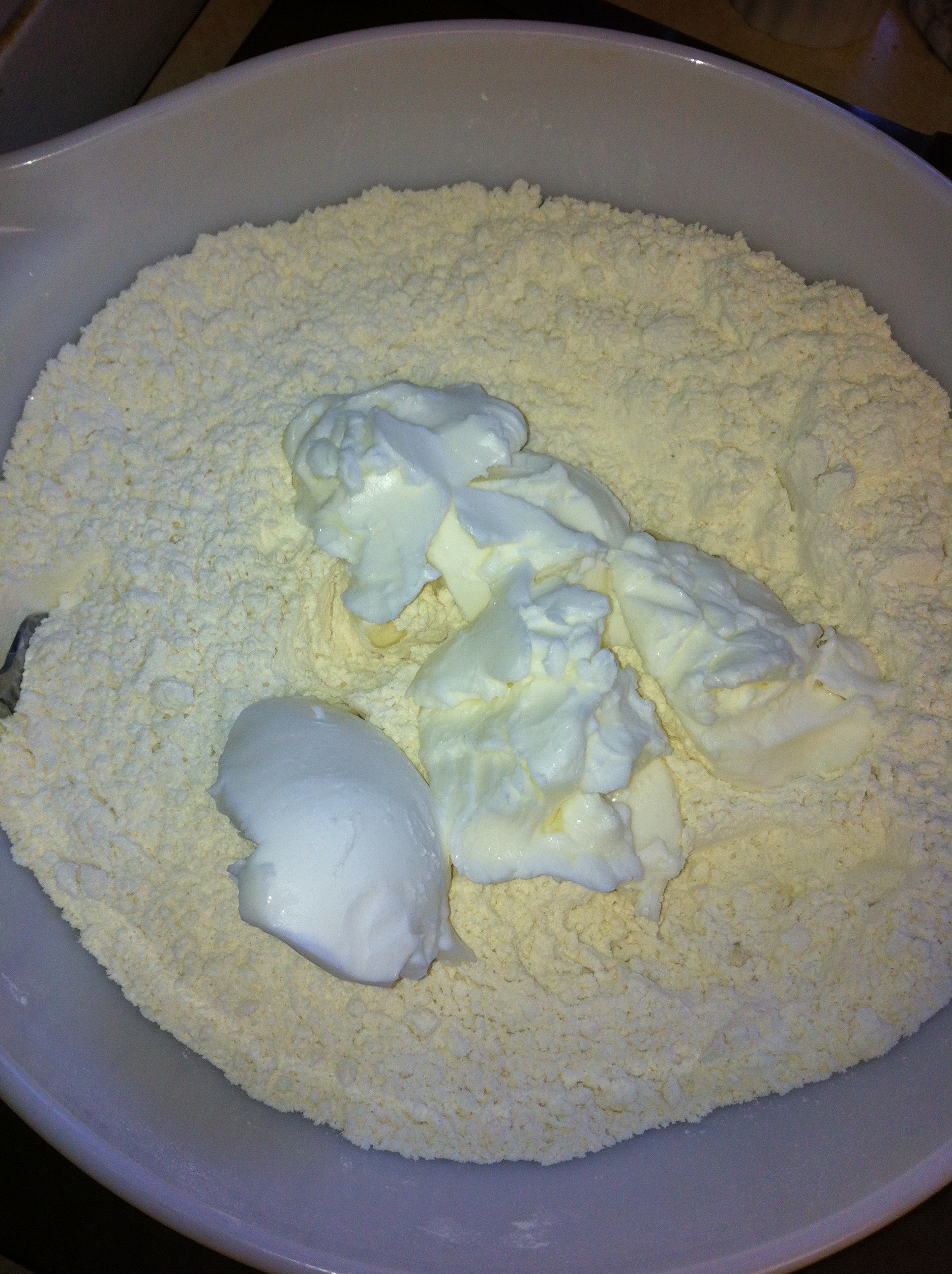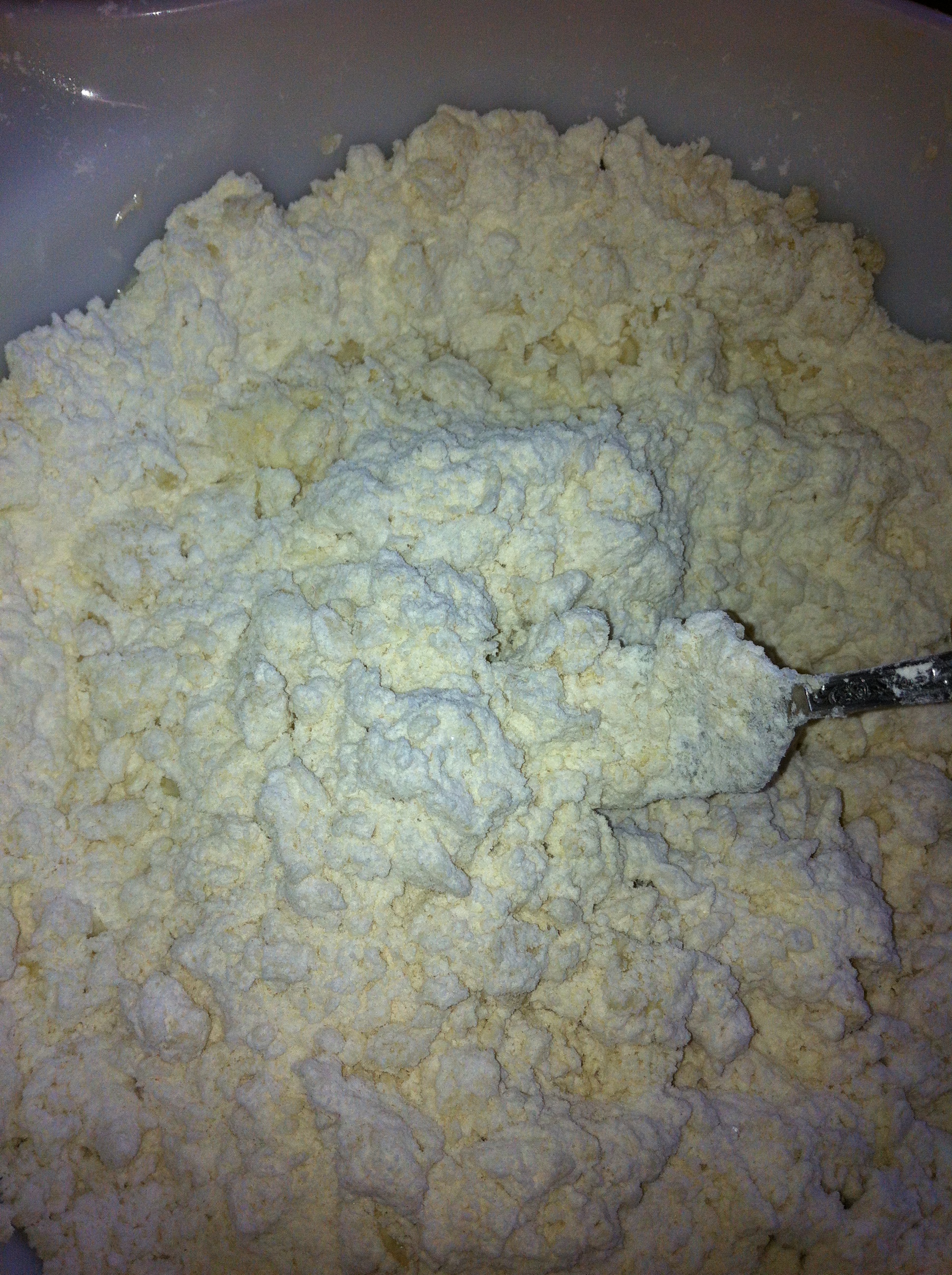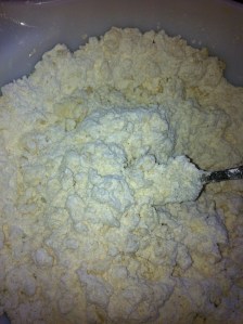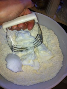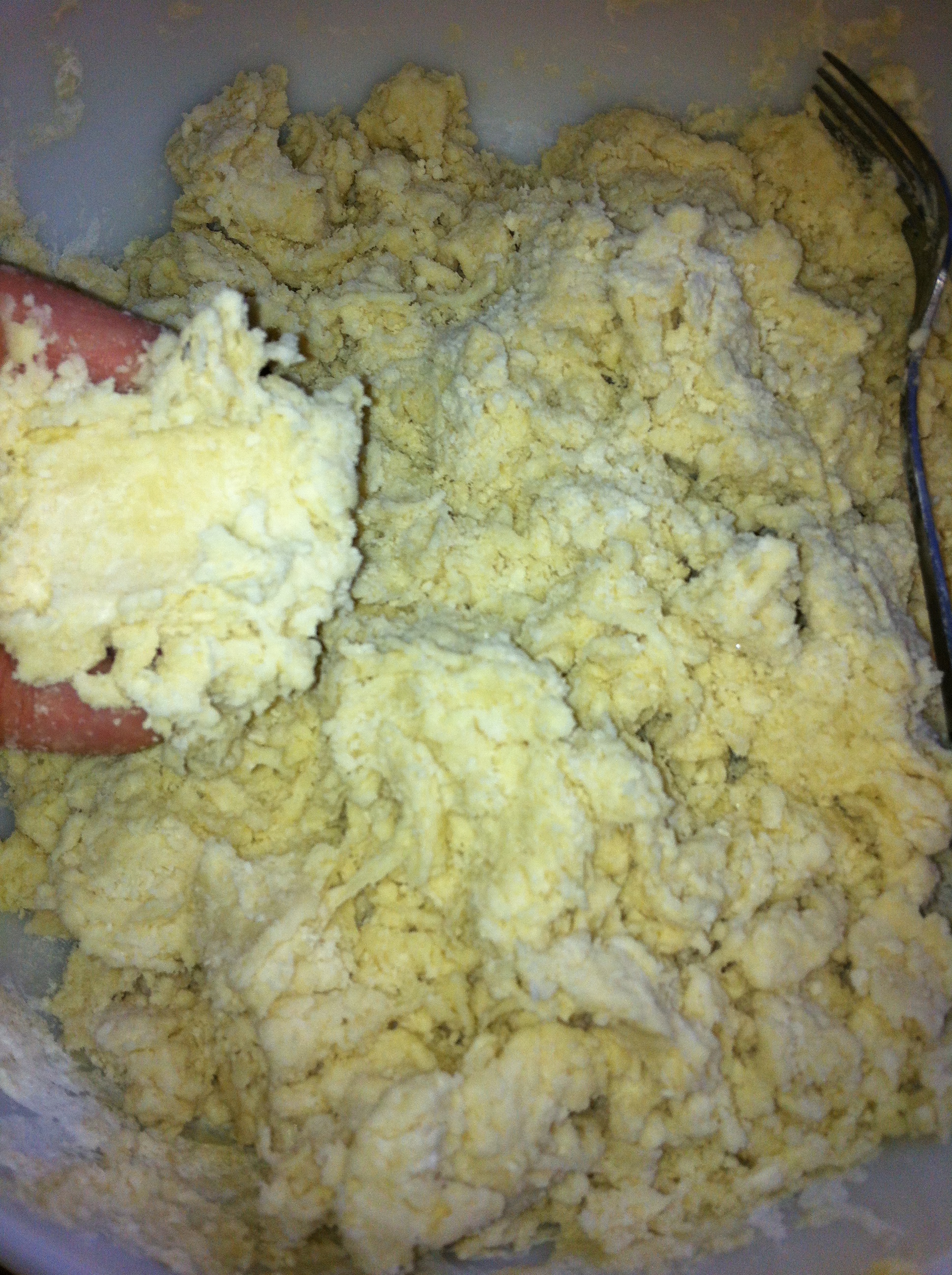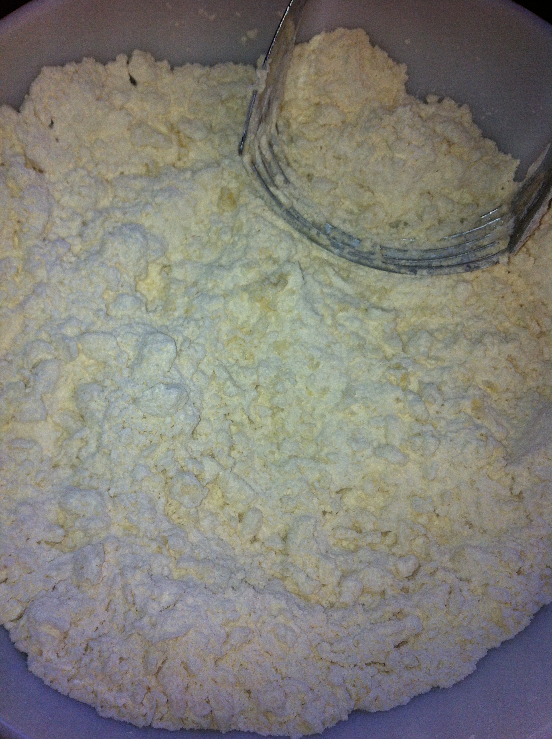 *Cut in with a pastry cutter {or use the tines of a fork if you don’t have a pastry cutter} the shortening/lard/coconut oil.