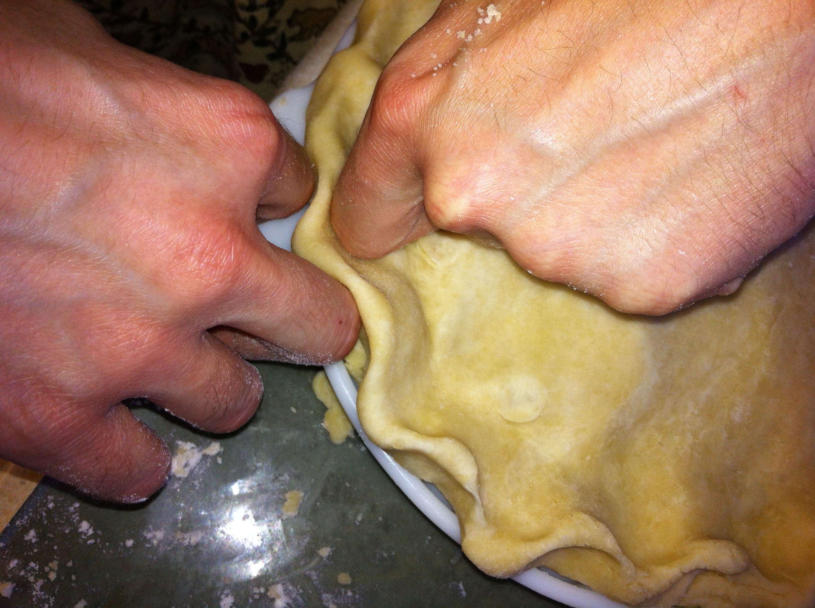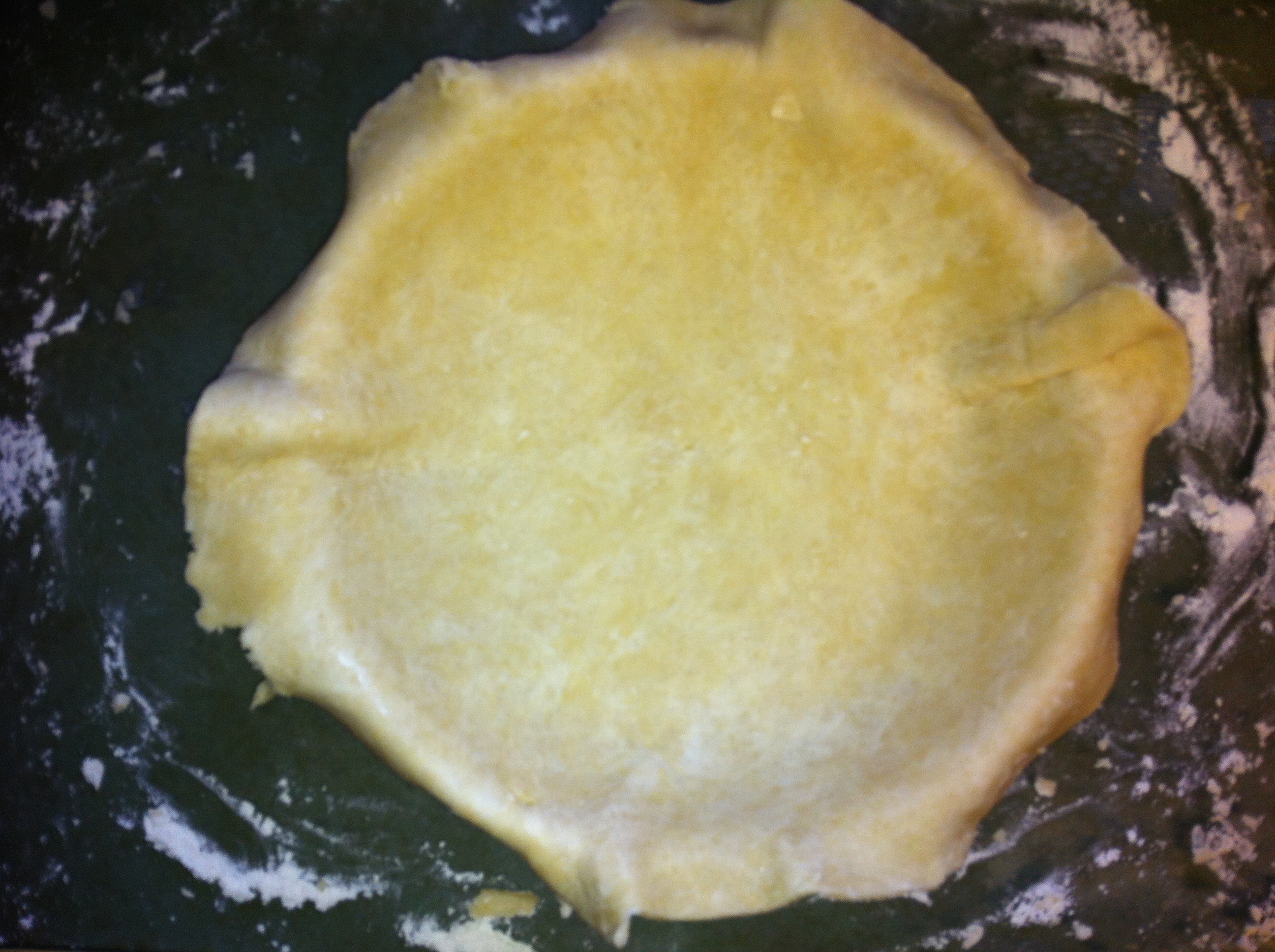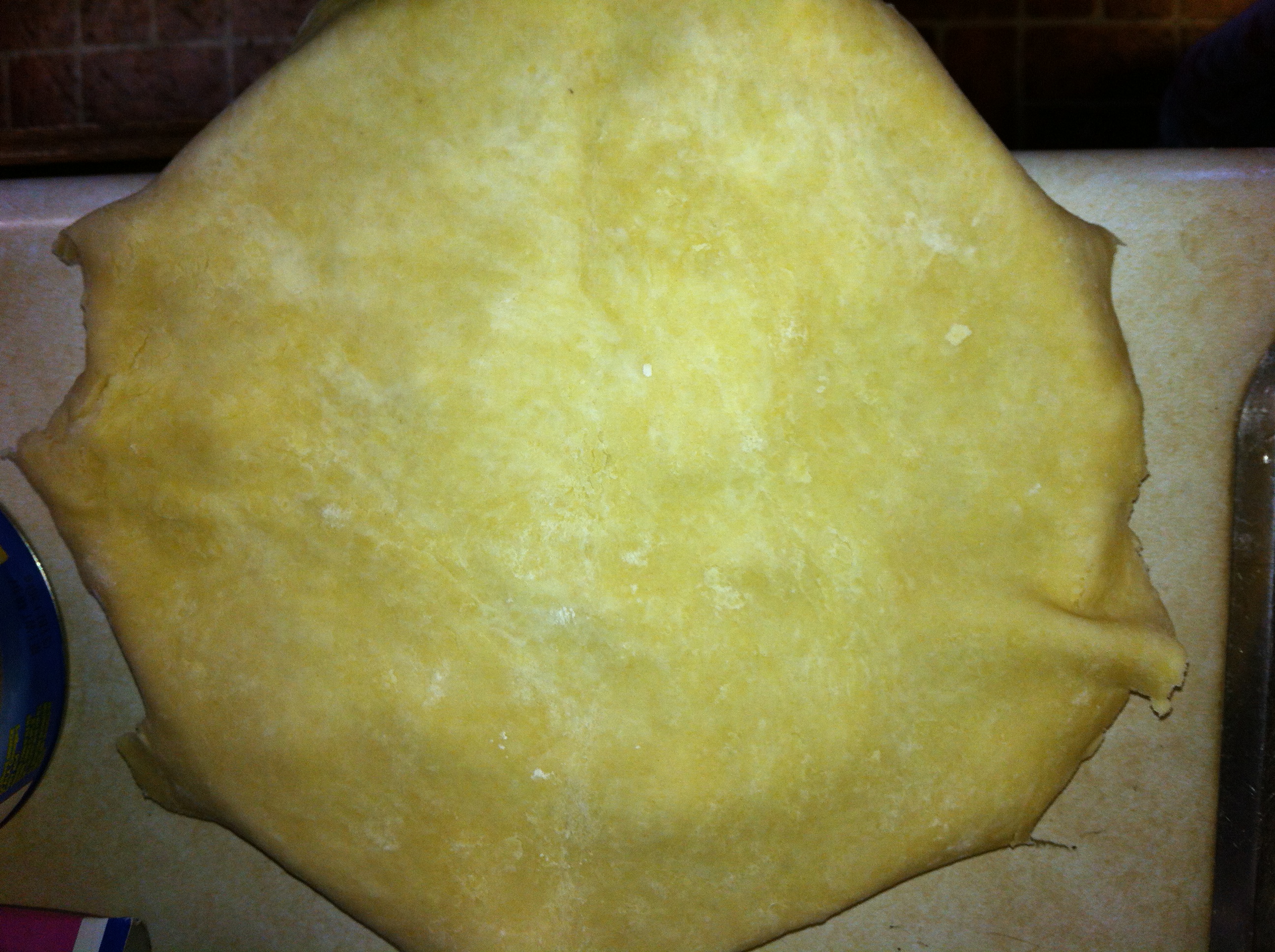 *Before it has a chance to really stick, pick up your dough disk and turn about a quarter of a turn, making sure it is still well floured underneath. Do this a couple of times throughout the rolling out process to keep from sticking. Roll out a bit, turn a quarter of a turn, roll out some more, etc.