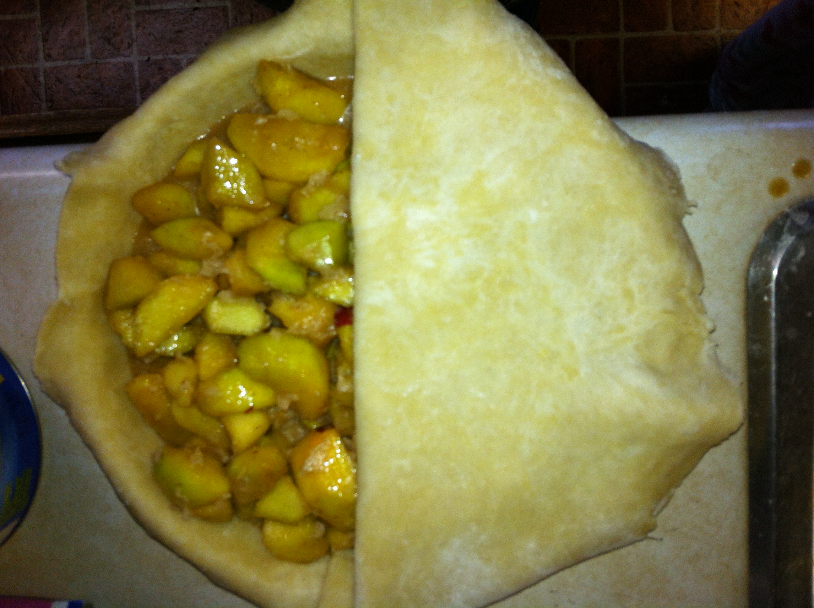 *Roll out your other ball of dough in the same way you rolled out the first. Fold up the same way and transfer to the top of the pie.