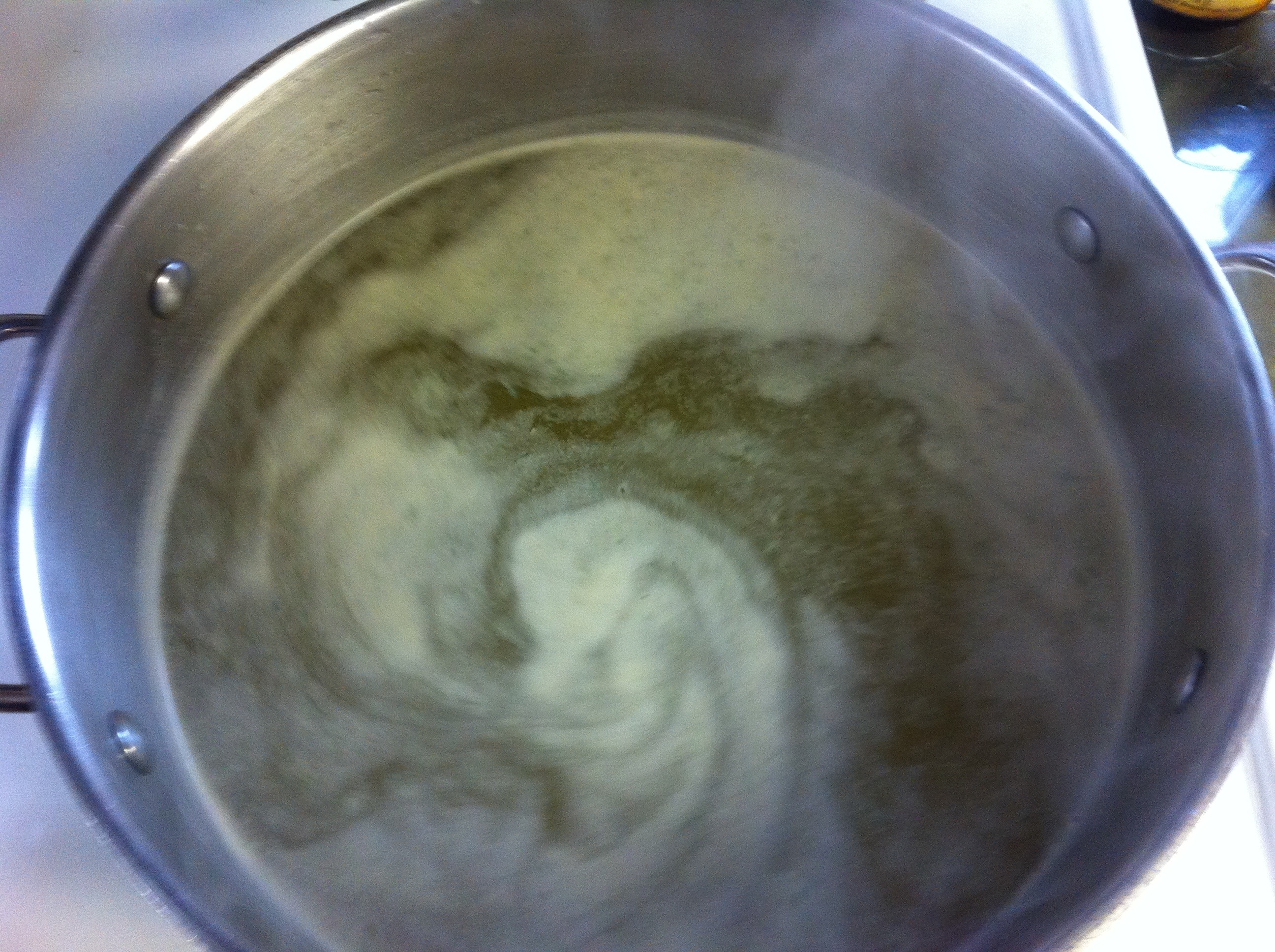 In a large stock pot heat chicken broth on high on stove.