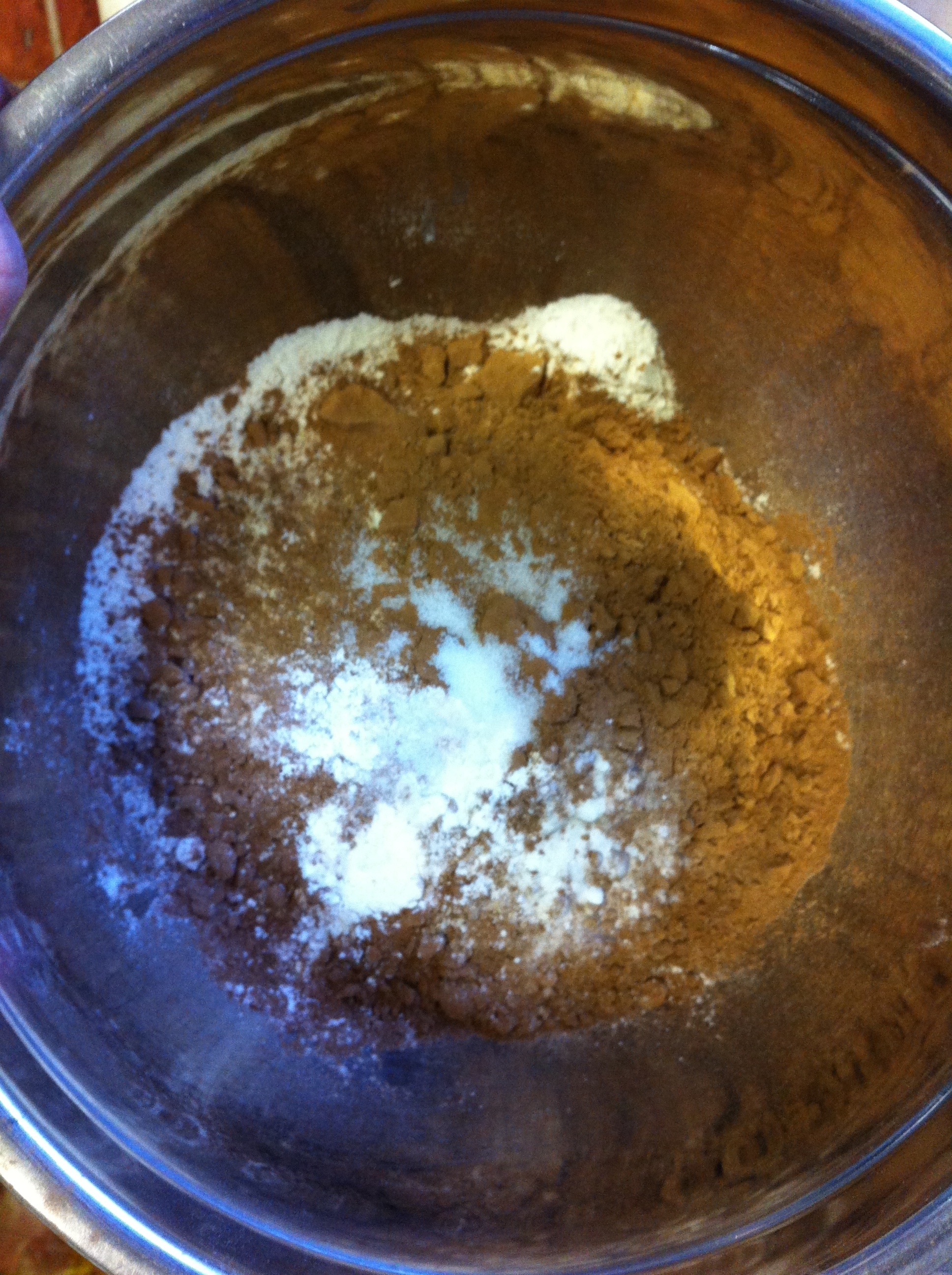 In a mixing bowl whisk together the flour, cocoa powder, baking powder, baking soda and salt.