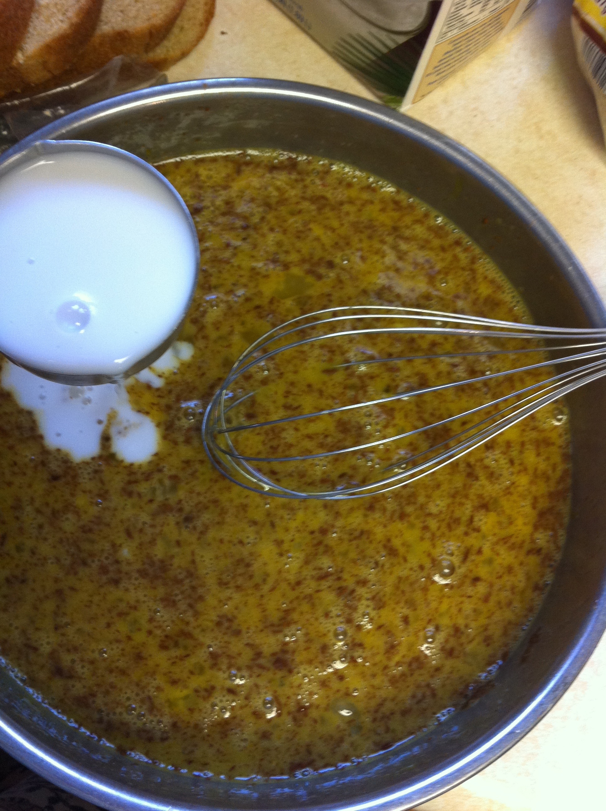*Add eggs, brown sugar, cinnamon and vanilla to a shallow bowl. Whisk well. Add coconut milk and mix in well.