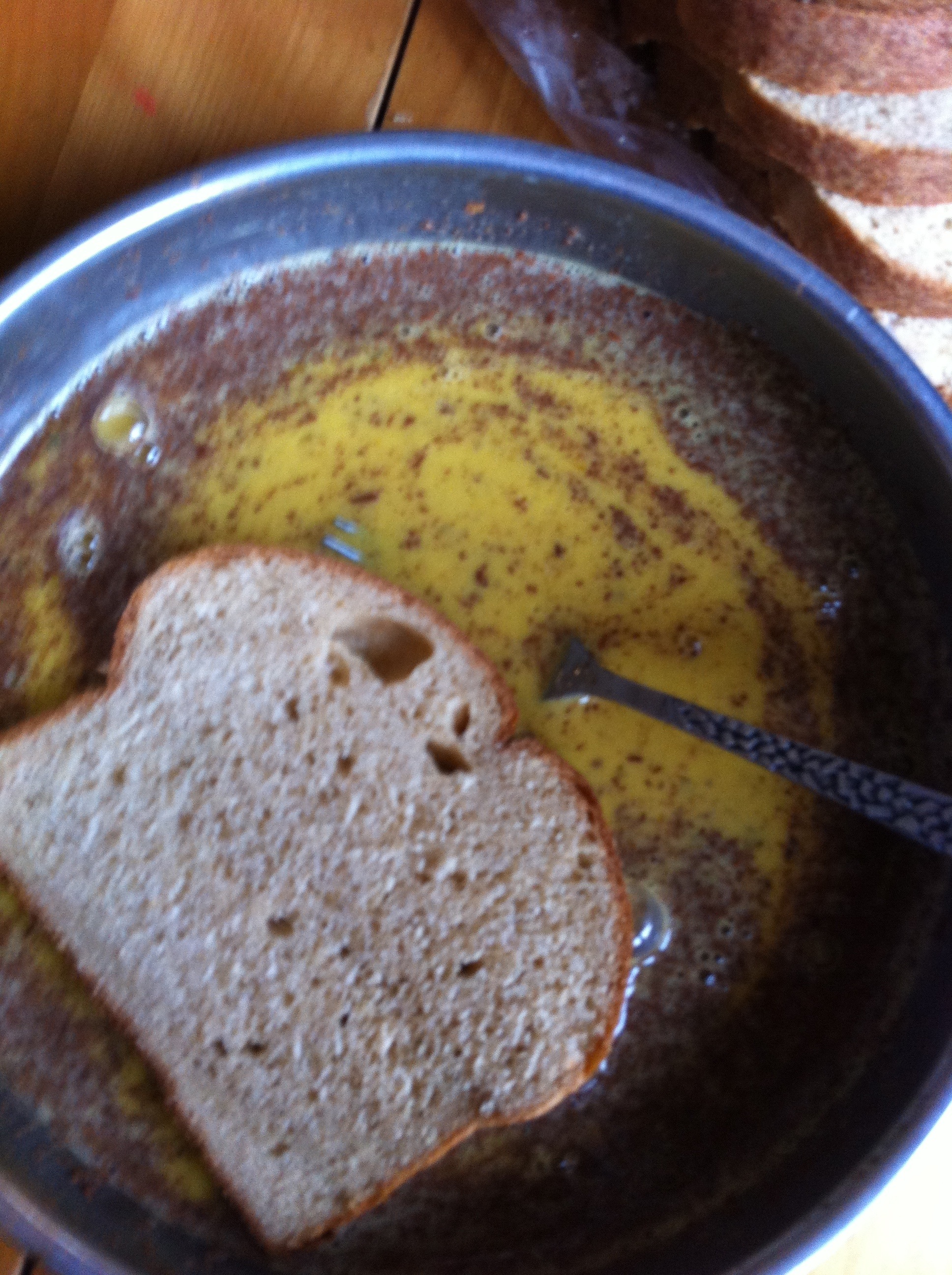 Give egg mixture a quick mix before starting the bread-dipping process. Dip bread in mixture and allow it to soak up liquid a bit – flip piece over and repeat.