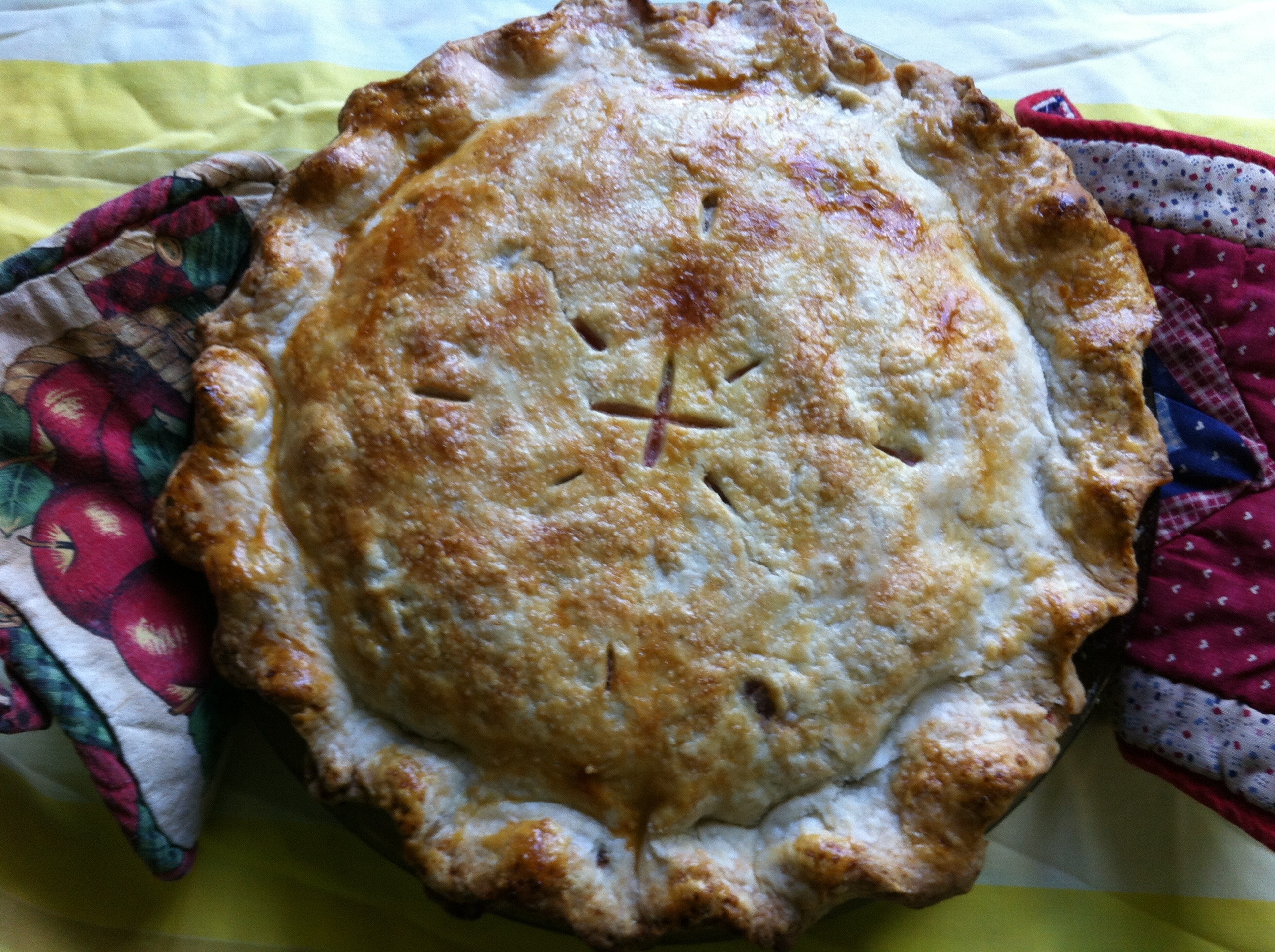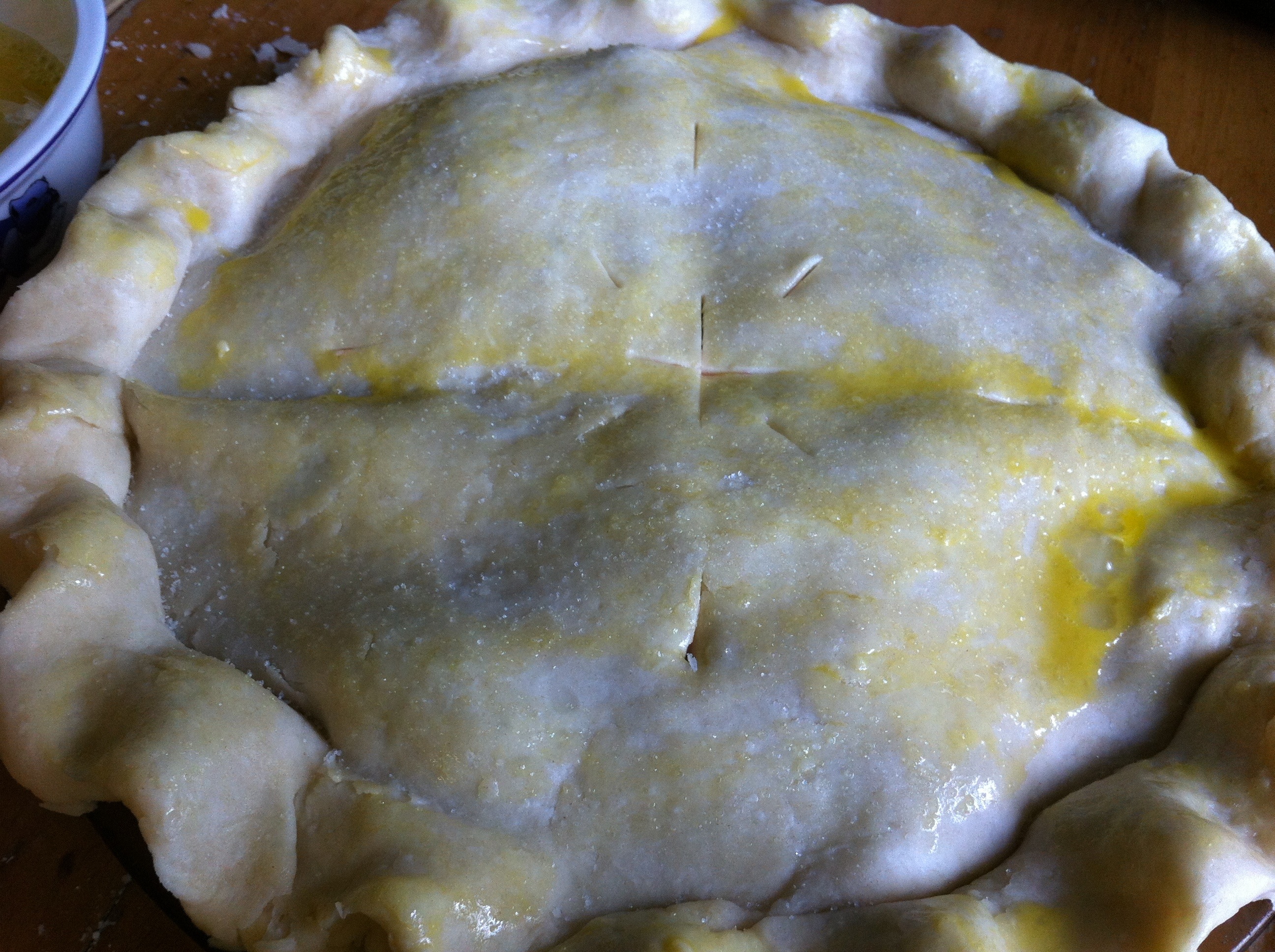 If desired, make an egg wash {1 egg + 1 t of water whisked together} and brush on top of crust to give it a little sheen and sprinkle with a little sugar. Make a few pretty vent slits on top of crust.