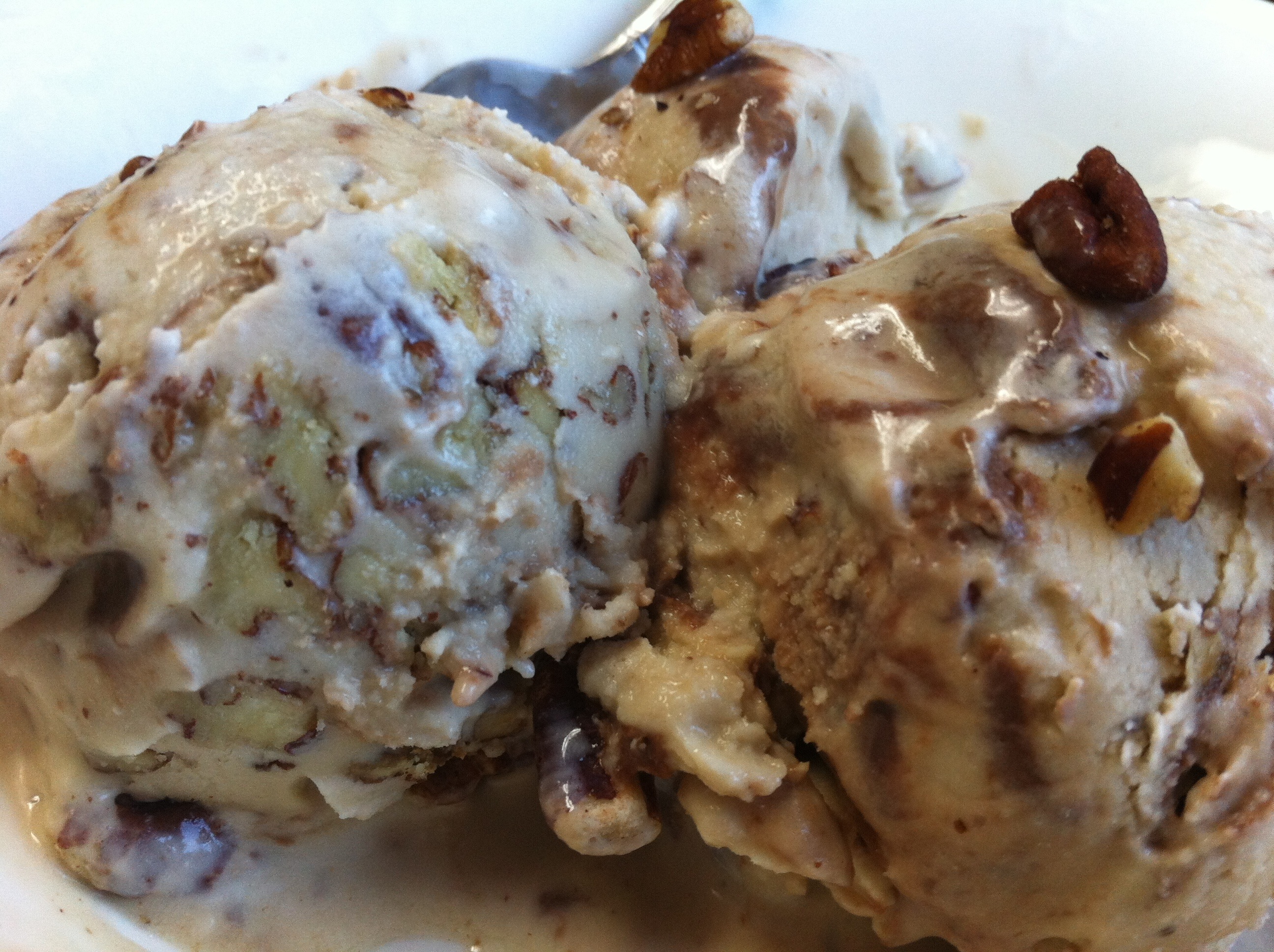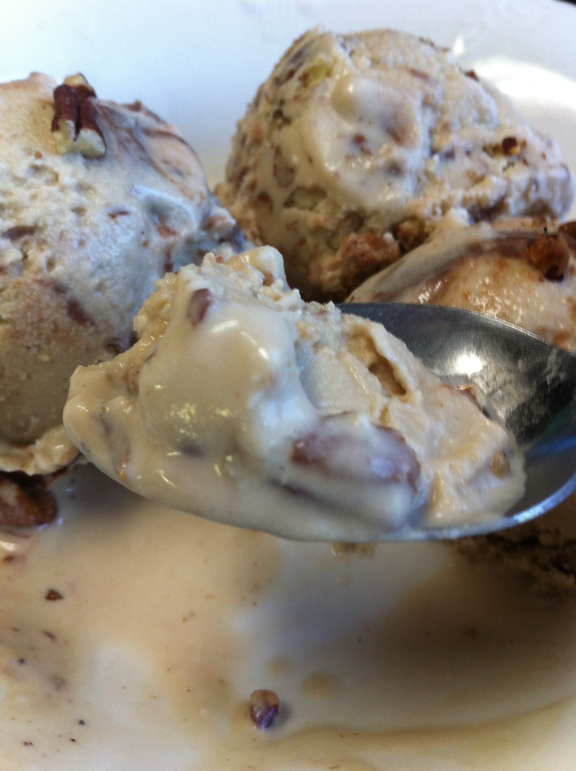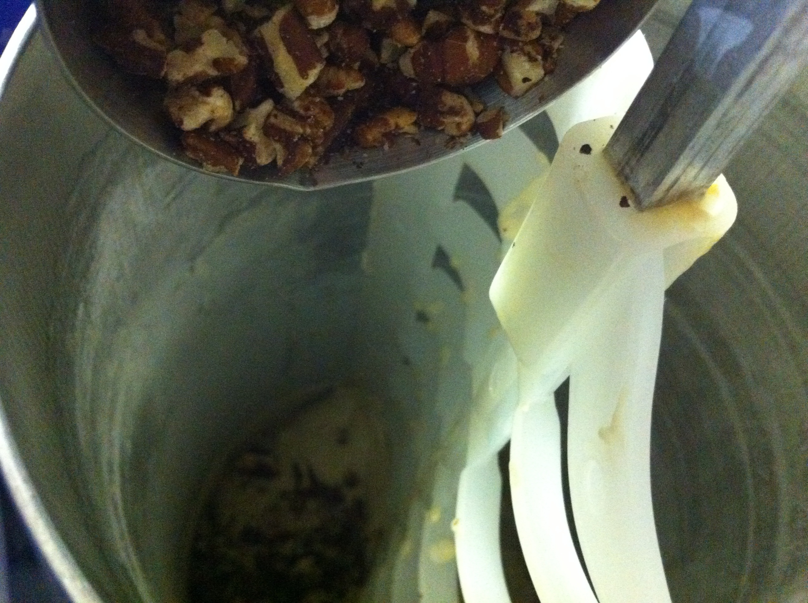 Add chopped pecans and churn until completely combined. I would start with a cup and add a little more after it is initially mixed in if you feel like being it being a little nuttier.