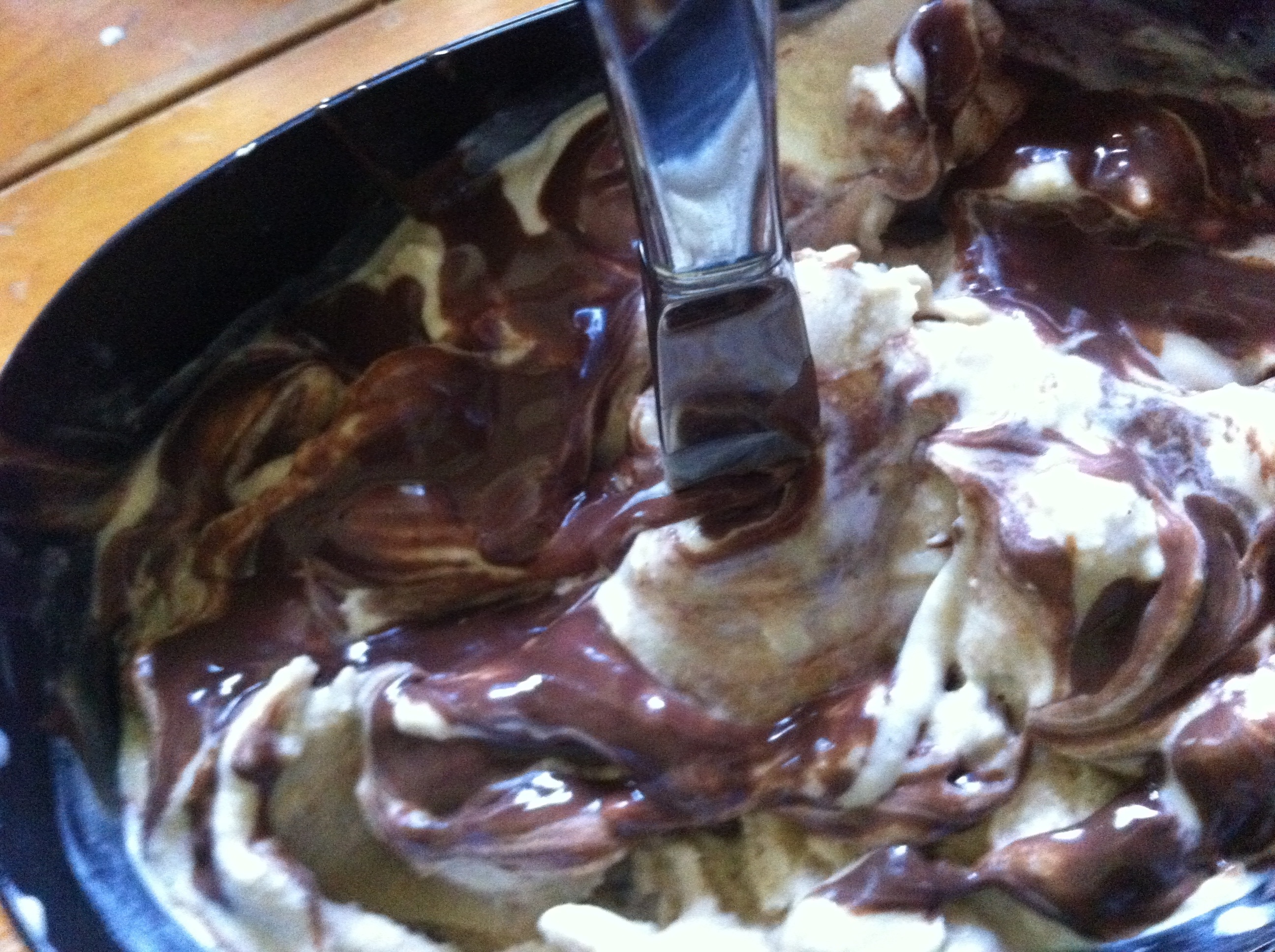 When the ice cream is done churning, spoon ice cream into a freezer safe storage container, alternating layers with spoonfuls of dark chocolate sauce. Once assembled, if desired, use a knife to make a “swirl” motion.