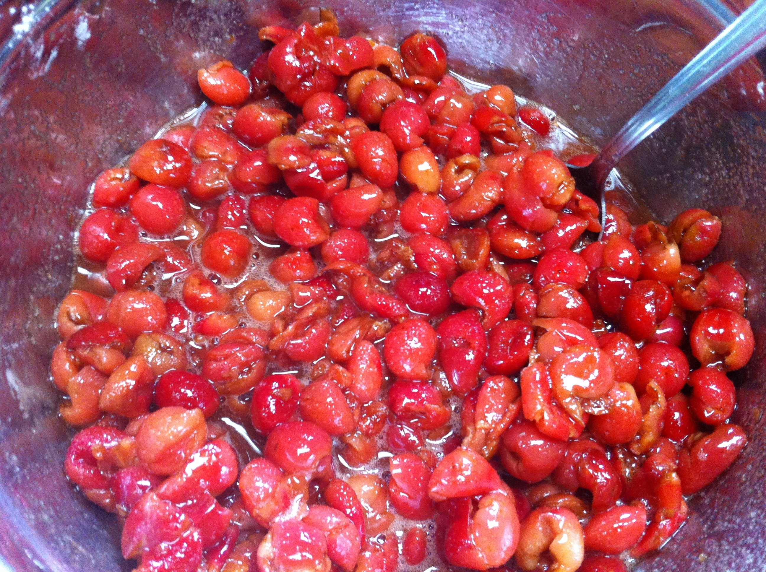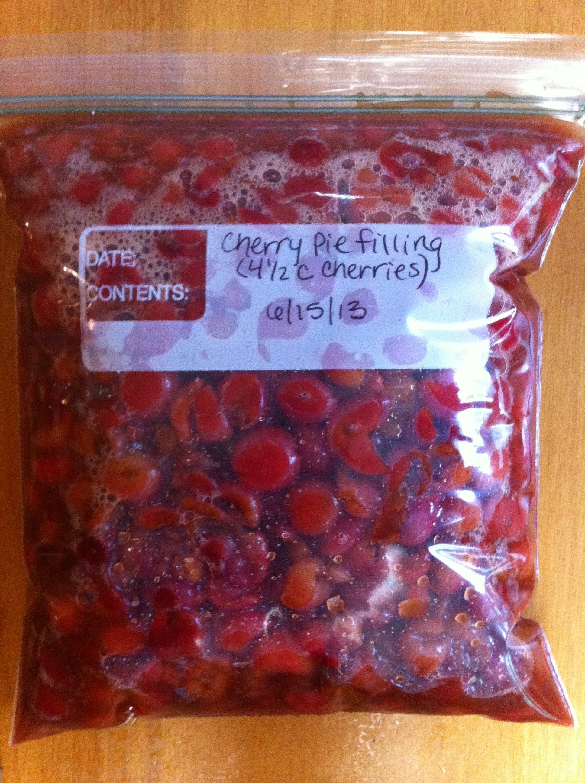 In a large mixing bowl add washed and pitted cherries. Add remaining ingredients and then mix together. Either place filling in a pie dough lined pie plate, top with dough and bake or place the filling in a quart sized freezer bag. Label and freeze for later use.
