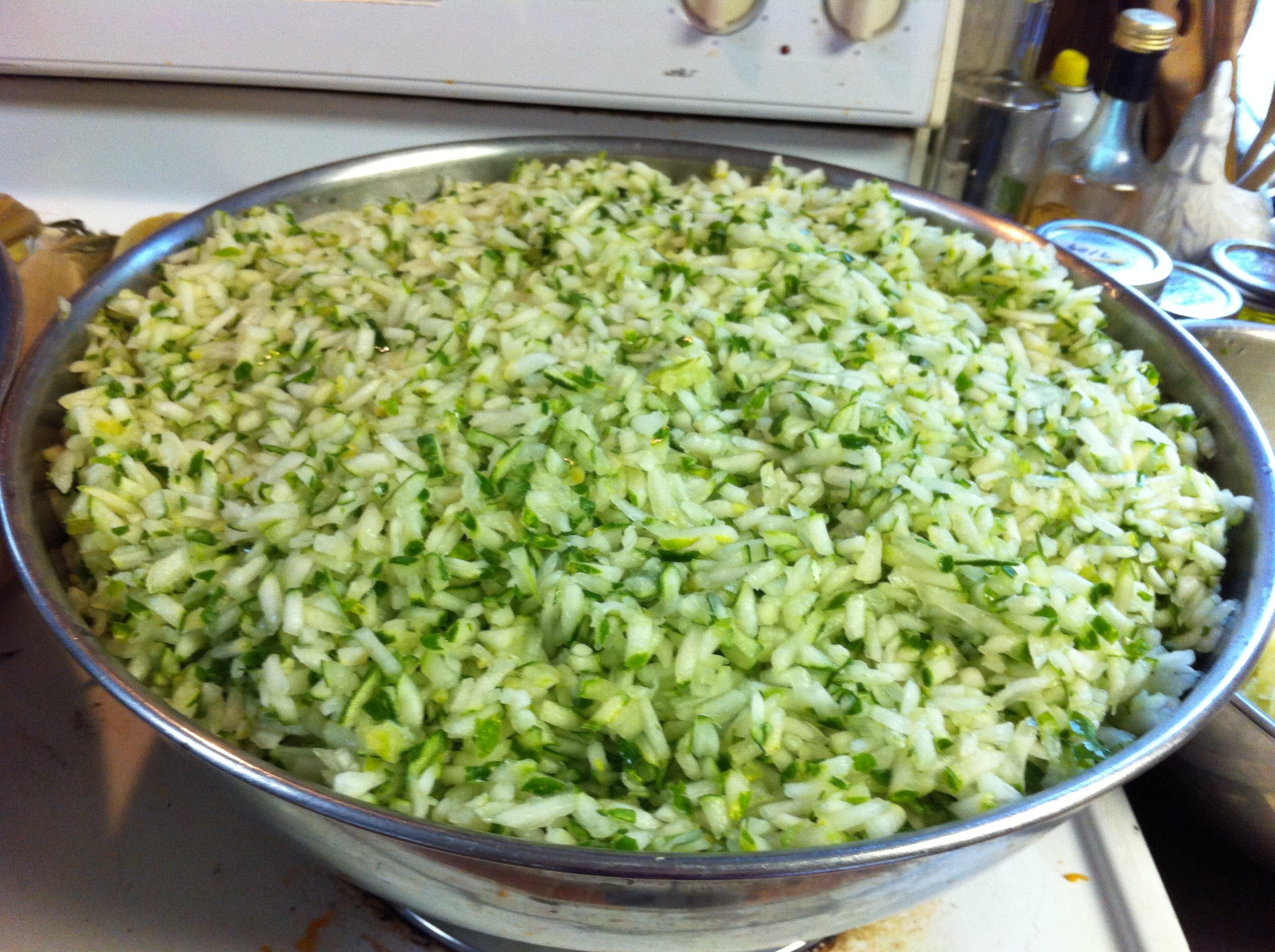 30 large, overgrown cucumbers, seeds taken out and shredded or chopped very fine {I actually used about 60 medium sized, fat cucumbers this time around}