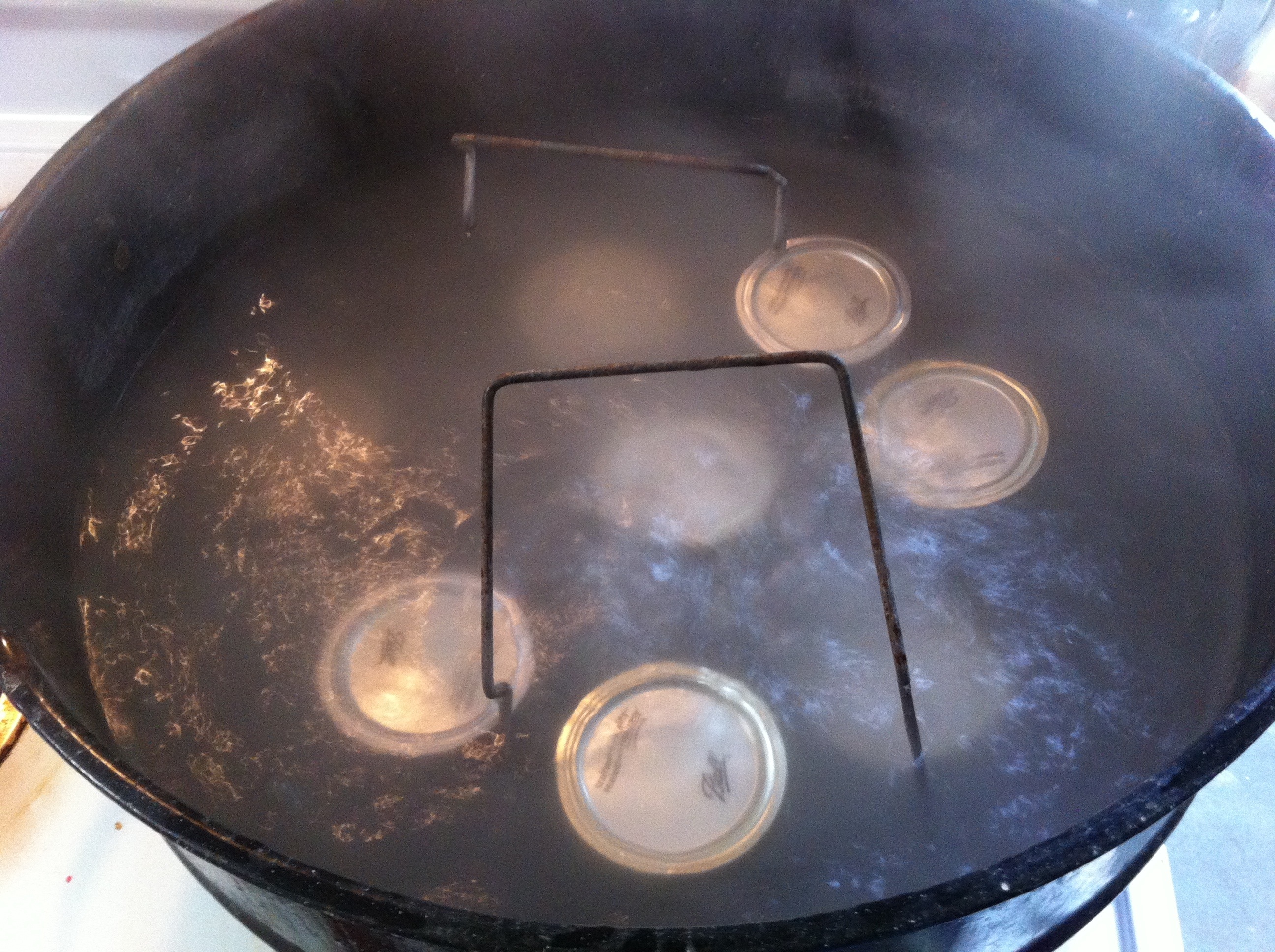 Make sure to have jars sterilized, hot and ready to go before the mixture is ready. How I do this is wash all of the jars in the dishwasher on the sanitize setting and then place them in a 170 degree oven to stay hot until I am ready to fill them. I also have the lids and bands washed and ready to go, in hot water on the stove.