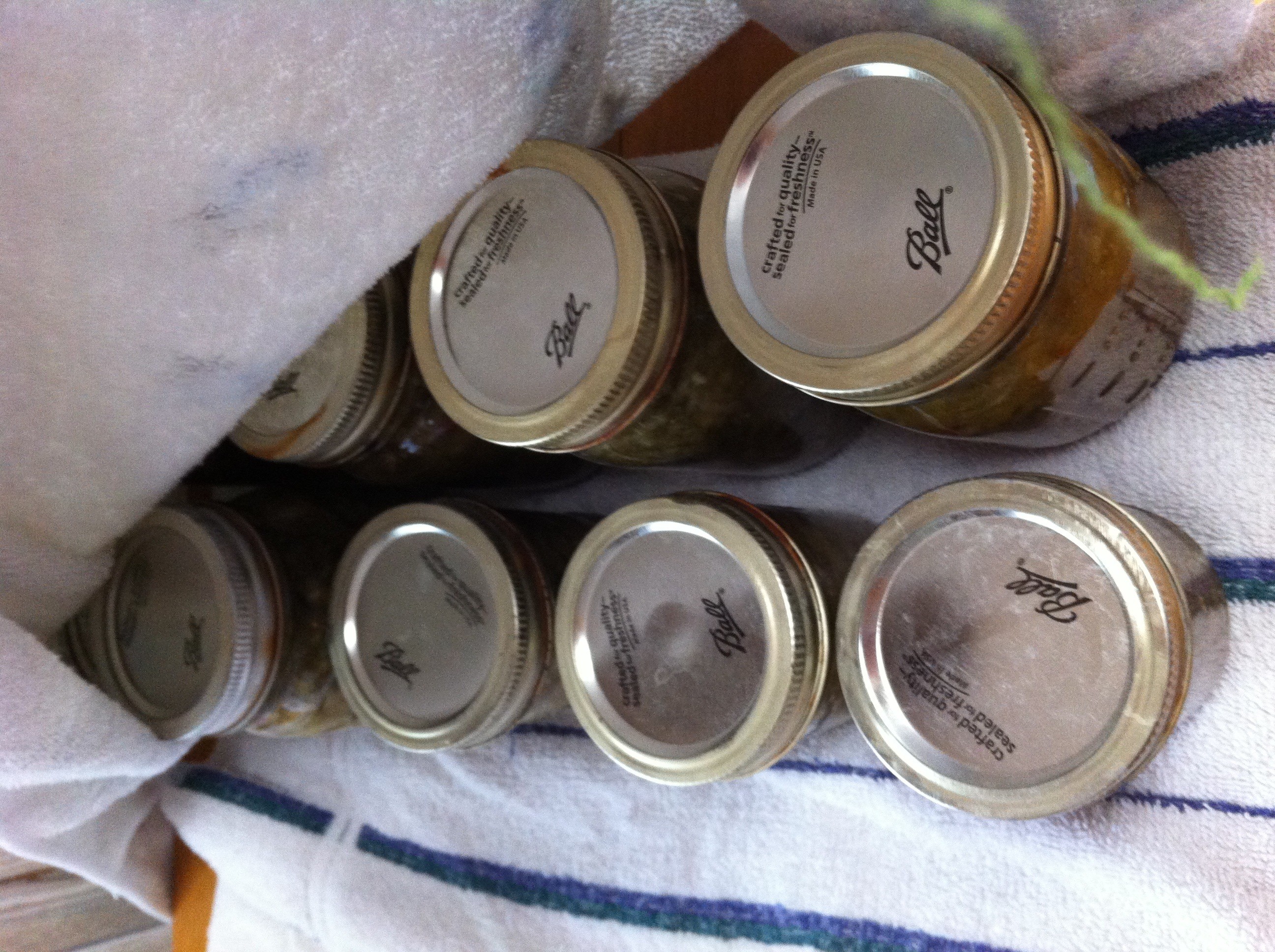 Allow the towel-covered jars to cool completely before moving. Make sure that the jars are sealed by pressing on the center of the lid. If it pops back it is not sealed and needs to be refrigerated and used. At this point you may take the screw on band off of the jar for storage, if desired. I like to do this so I can re-use the bands for other canning projects and I think it also helps to keep the bands from rusting as much. Label jars and store for later use or gifts!