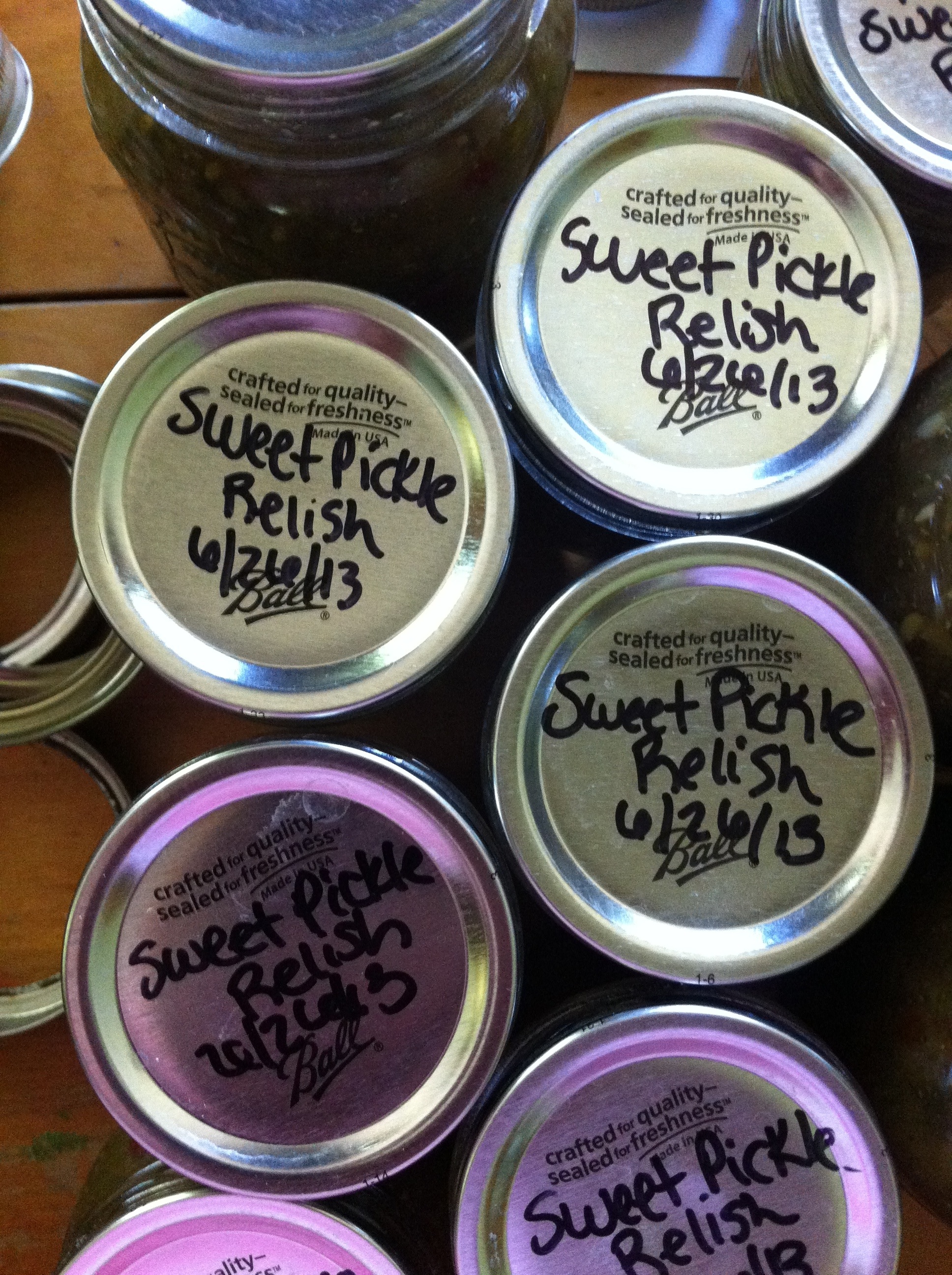 This recipe for sweet pickle relish is a great one to use for large, overgrown cucumbers that might be past their prime for pickle making. I know we always have cucumbers that grow HUGE because they have been hiding under the vines, or simply because we have neglected picking. For an even zestier or spicier relish, substitute some more of the red or green peppers for jalapenos or other spicy peppers. Happy canning and enjoy! -Shelley