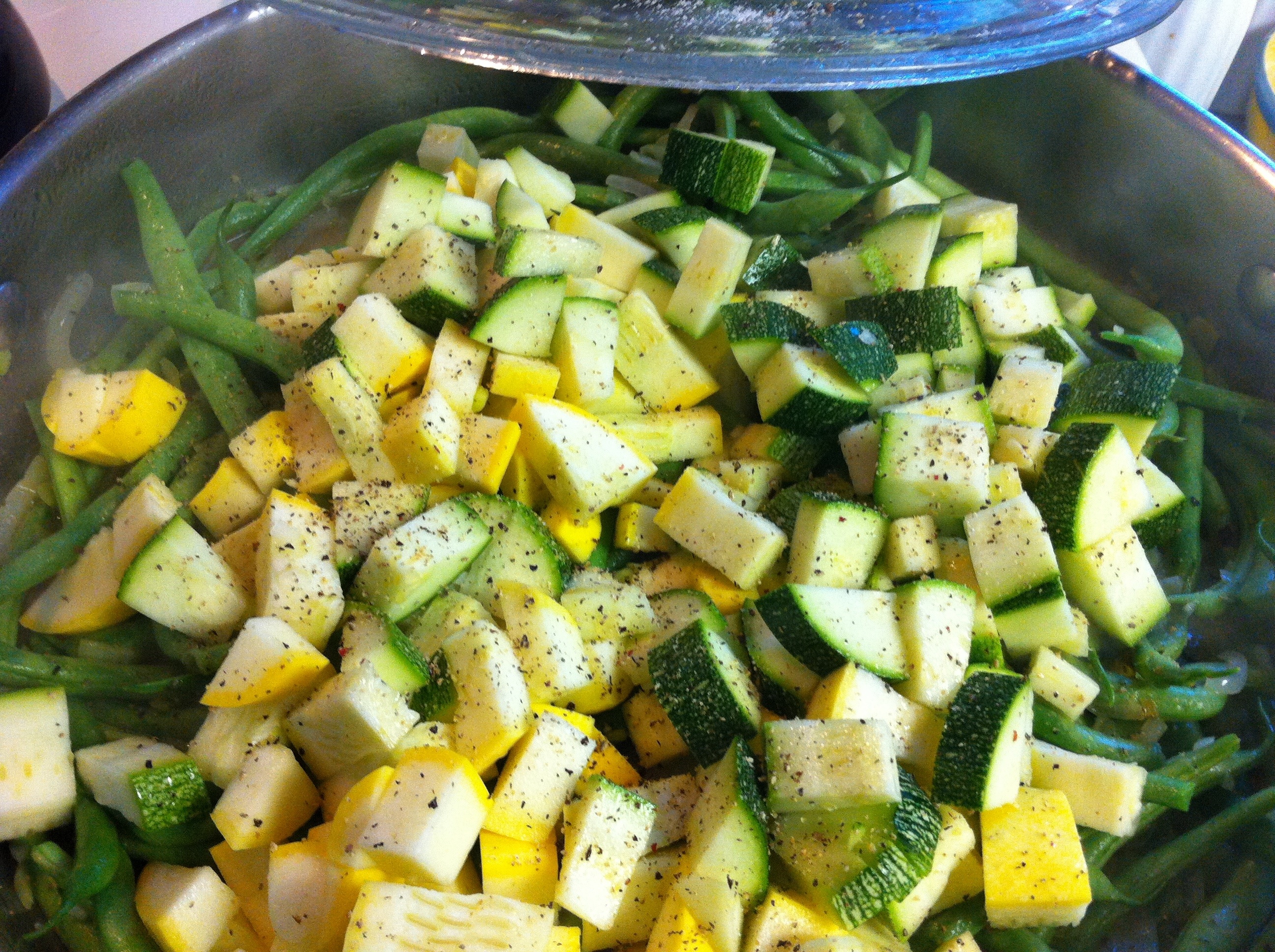 Cover with a lid and allow the veggies to steam for a couple of minutes. Uncover, stir green beans and add squash, zucchini, cracked pepper and remaining chicken stock. Cover with lid and allow to steam until veggies are desired tenderness.