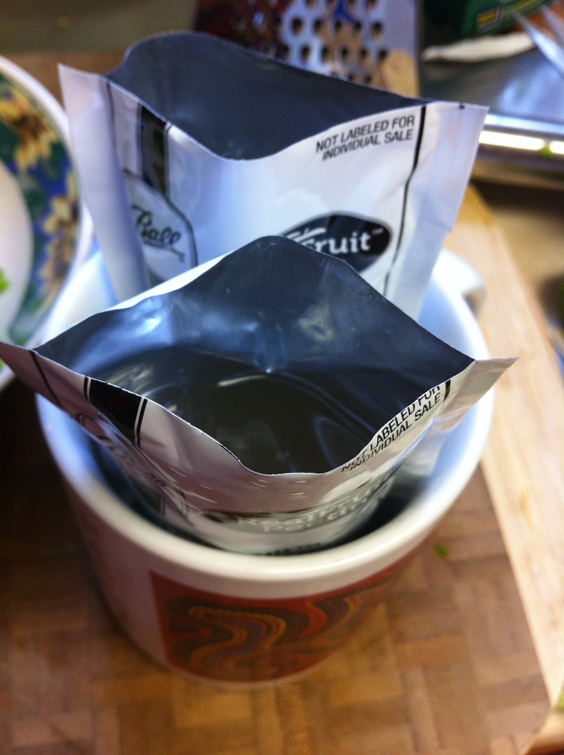 After the 10 minute boil, stir in the pouches of liquid pectin and remaining chopped peppers. {Tip: have the tops of the packages already cut off and place in a cup until ready to use.} Bring to a hard boil and boil for 1 more minute.