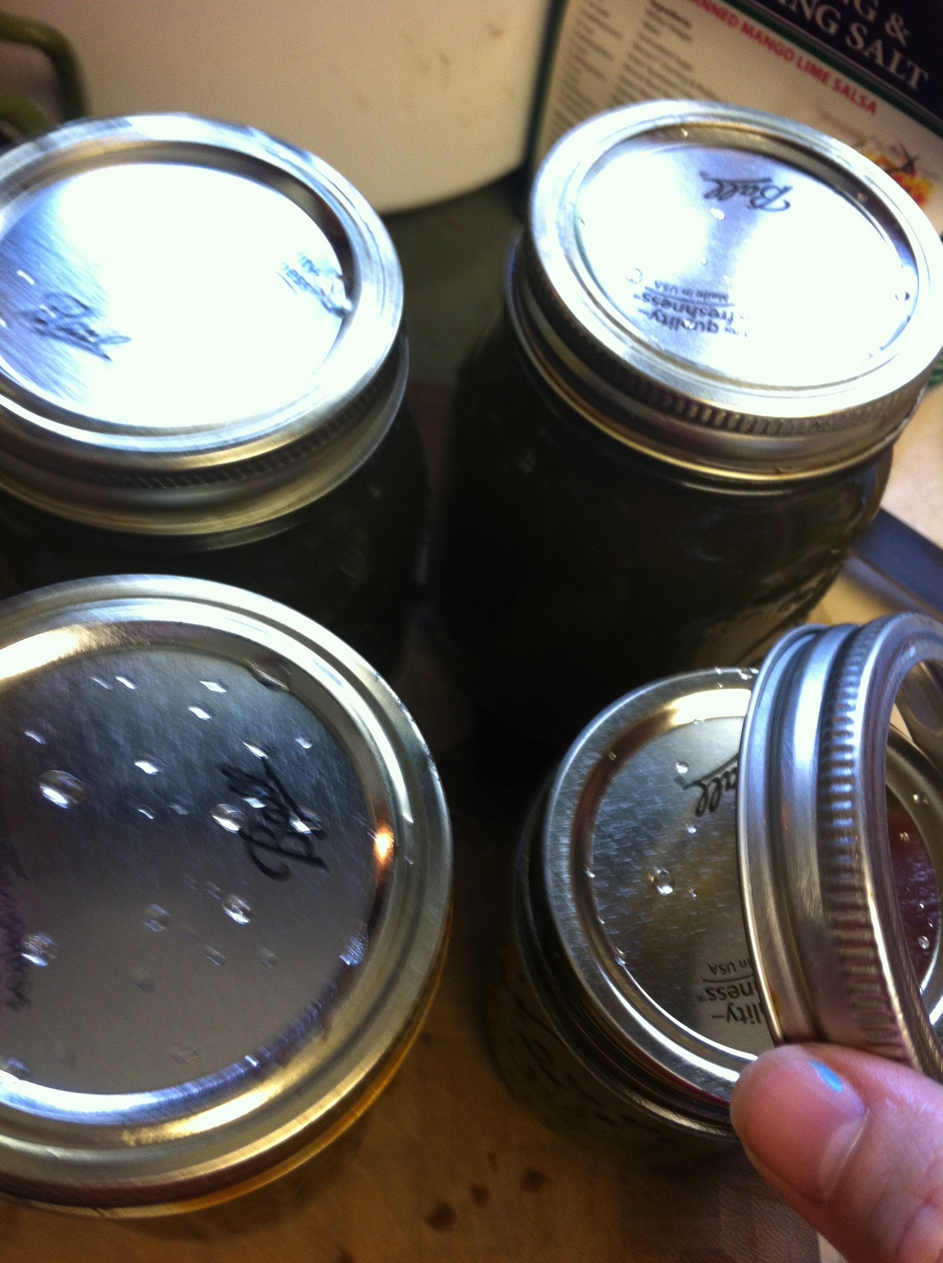 Once cool, check to make sure all of the jars have sealed by gently pressing in the center of the lid. If it pops back, place in the fridge and use. If sealed, remove screw on lids if desired and then label and date the jar.