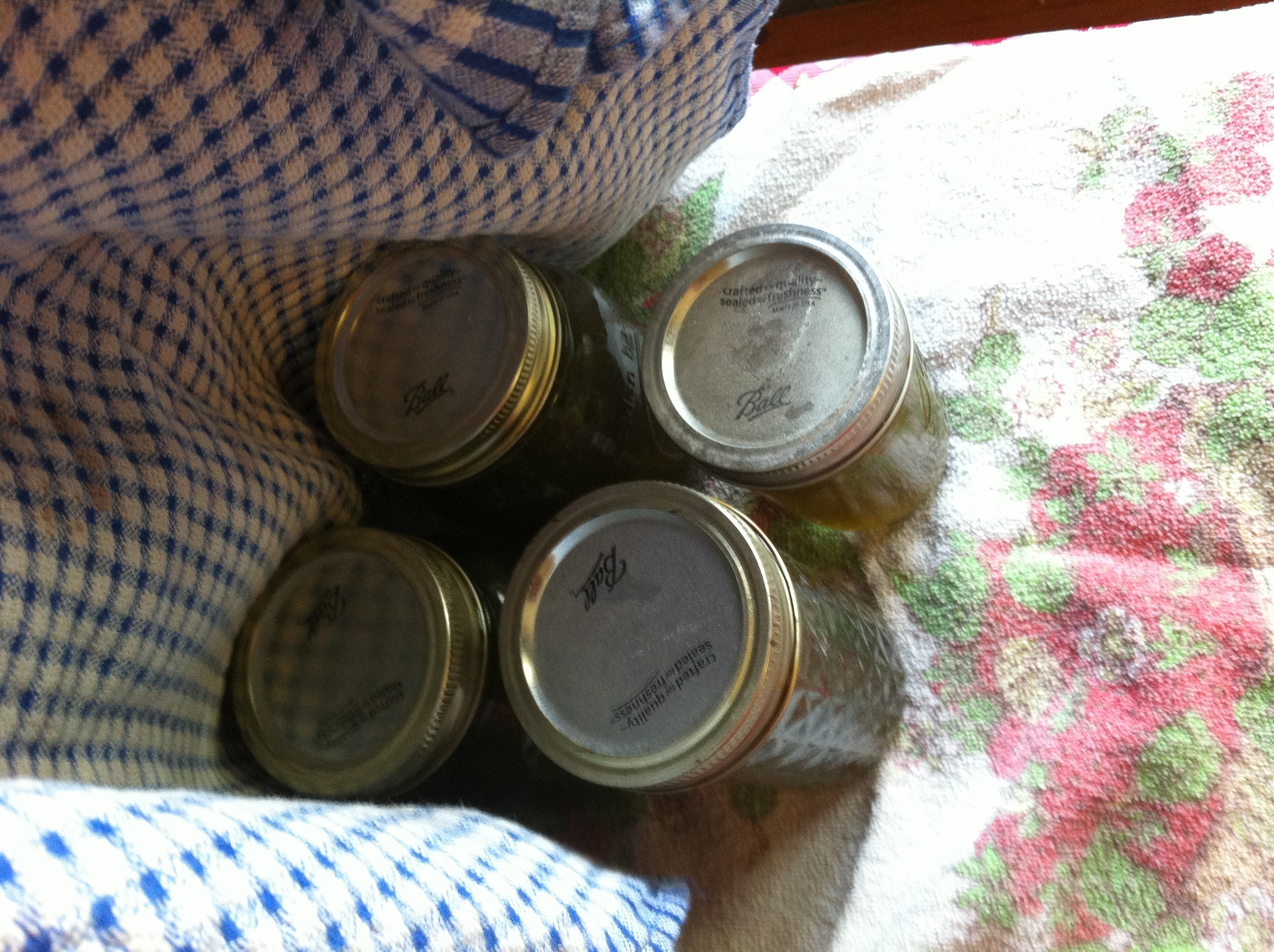 When jars are finished processing, remove from water and place on a towel lined surface and cover with another towel until completely cooled.