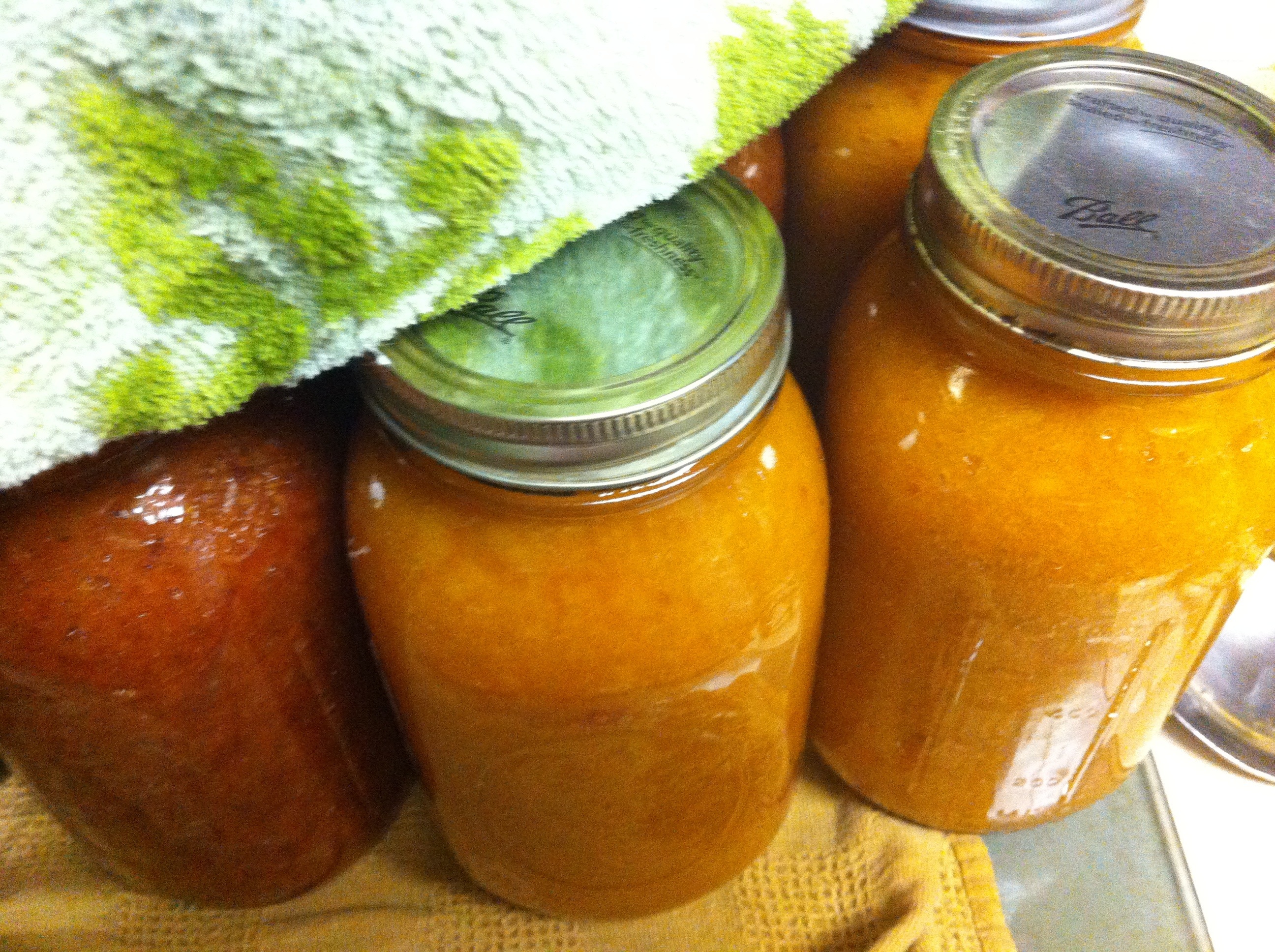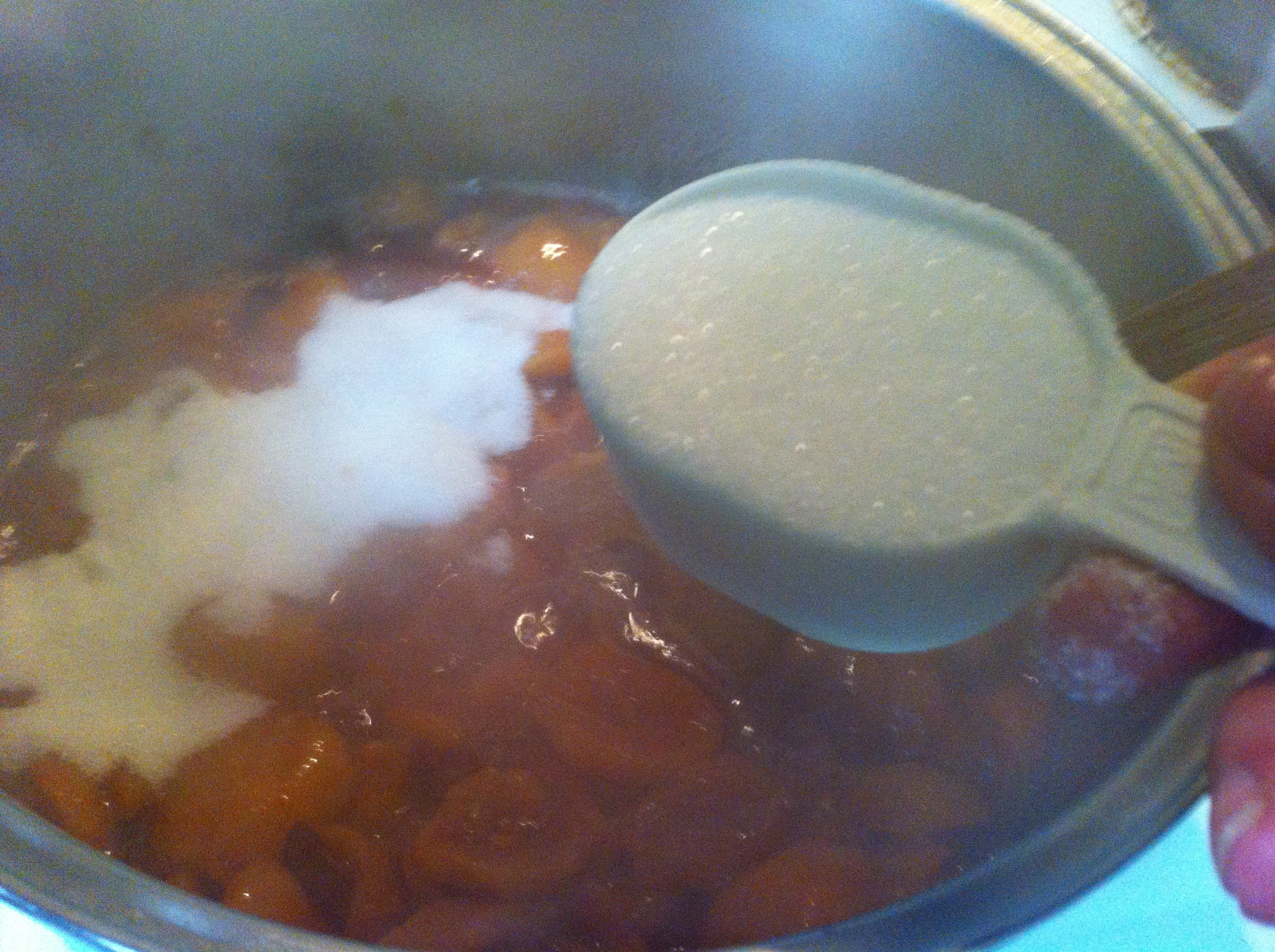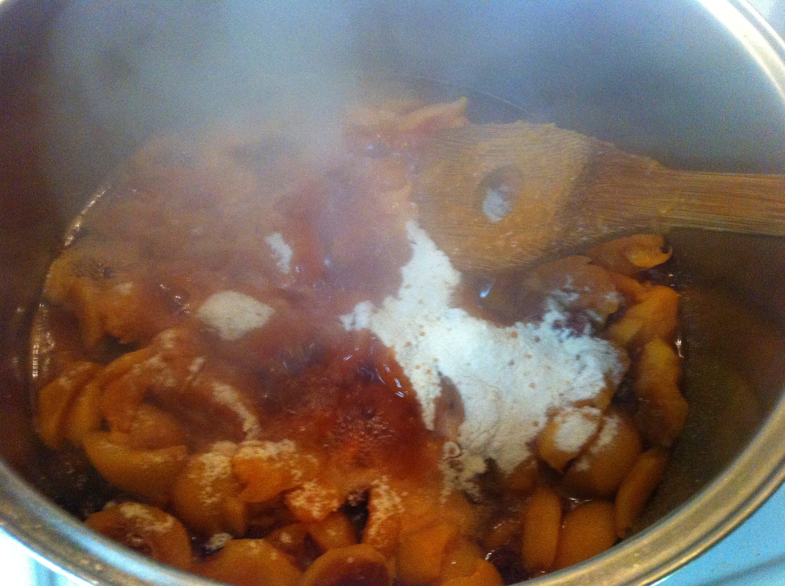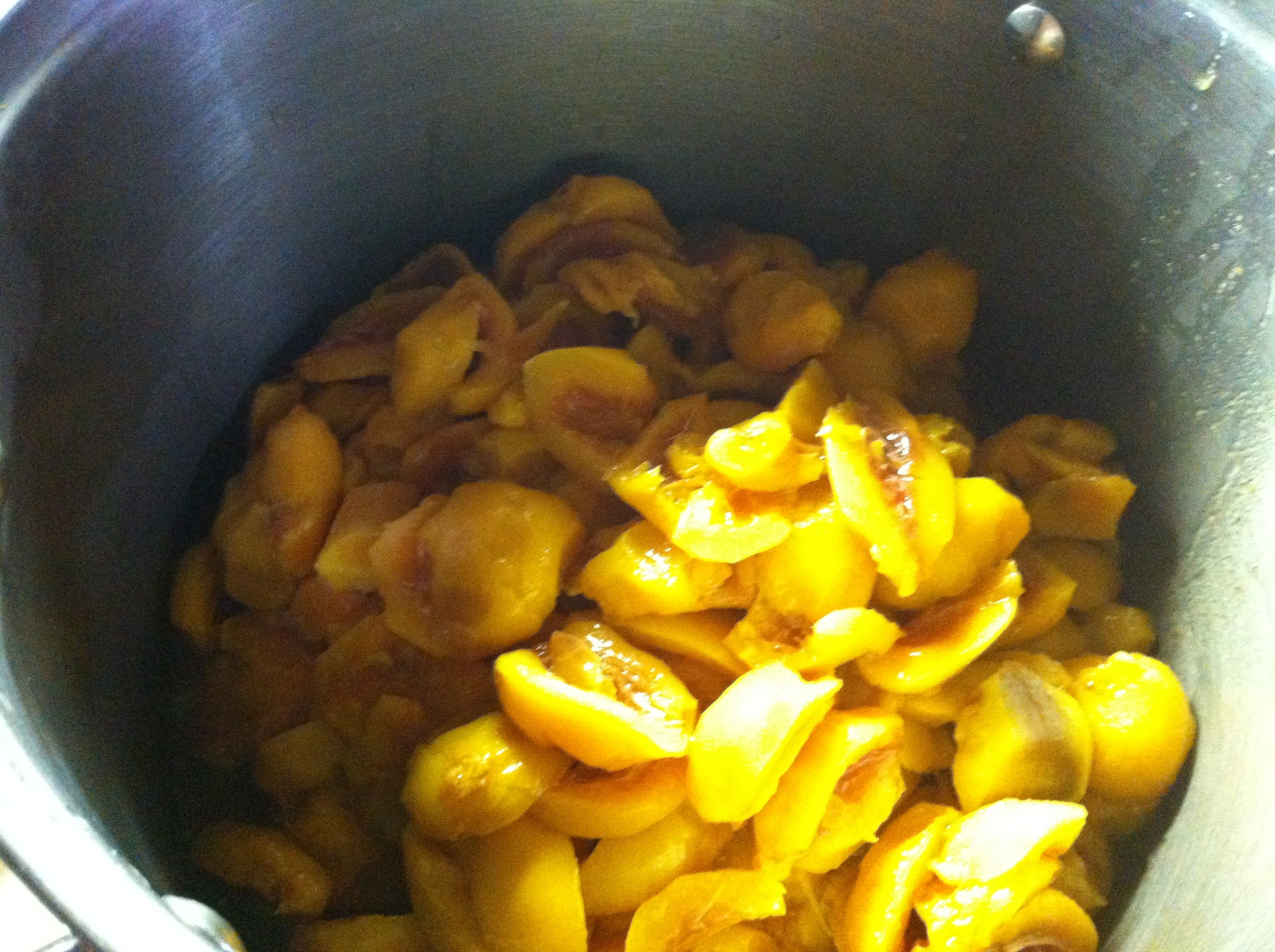 I used Ball Low or No Sugar Pectin, which I prefer to use instead of regular pectin because you don’t have to use an exorbitant amount of sugar like the regular stuff. I apologize in advance if I combine some pictures using the peach batch and some using the peach/cherry batch. I was sort of in a frenzy with everything, but I figured I would try to make good out of the situation by not only making the goodies, but getting pictures for a post as well! Luckily, the other day I had sterilized a lot of mason jars and placed them in the oven to use sometime in the near future. So, I just turned the oven on at 170 degrees and let them get hot – so at least I didn’t have to worry about that!