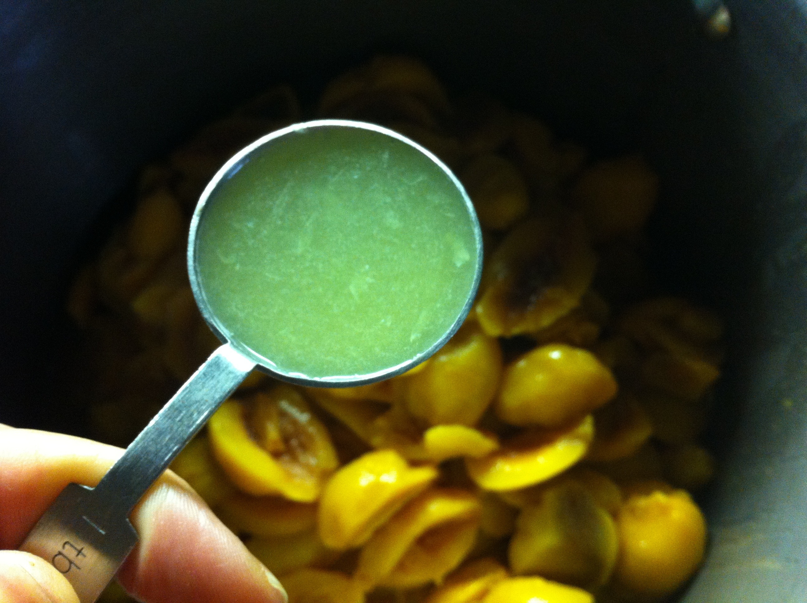 I wasn’t planning on making this preserves today, but the decision was sort of made for me when I walked down to the basement to discover that one of my daughters had left the deep freezer door WIDE open yesterday in the attempt to search out a popsicle. Hence, EVERYTHING was defrosted. So, I have had a late night of canning, trying to preserve some of the fruits and veggies that were being preserved in the freezer up until …well…yesterday. It is currently 1:48 a.m. and I decided now is as good of a time as any to start this post since I have to wait for the batch of spaghetti sauce in the canner to finish processing. As a side note, in case anyone is interested, I believe popsicles and children in the basement by the freezers are going to be outlawed for a time in this house. *Sigh* I suppose I had to use those frozen tomatoes and peppers sometime that were being stored. I just didn’t want to be forced into it. Anyway, this post isn’t about spaghetti sauce, it is about the other thing I canned tonight before that…Peach Lime Preserves! I actually made one batch just using peaches and another batch using mostly peaches and some cherries {because there was a bag of those that got defrosted as well that needed to be used up!} Both turned out very tasty! I added just a little bit of sugar to take the tartness away, but not so sweet that you go into a sugar coma! I also tripled the recipe, so the pictures will look like they are bigger than the recipe indicated for this reason. Also, I wouldn’t make a bigger batch than triple otherwise it might not set up appropriately.