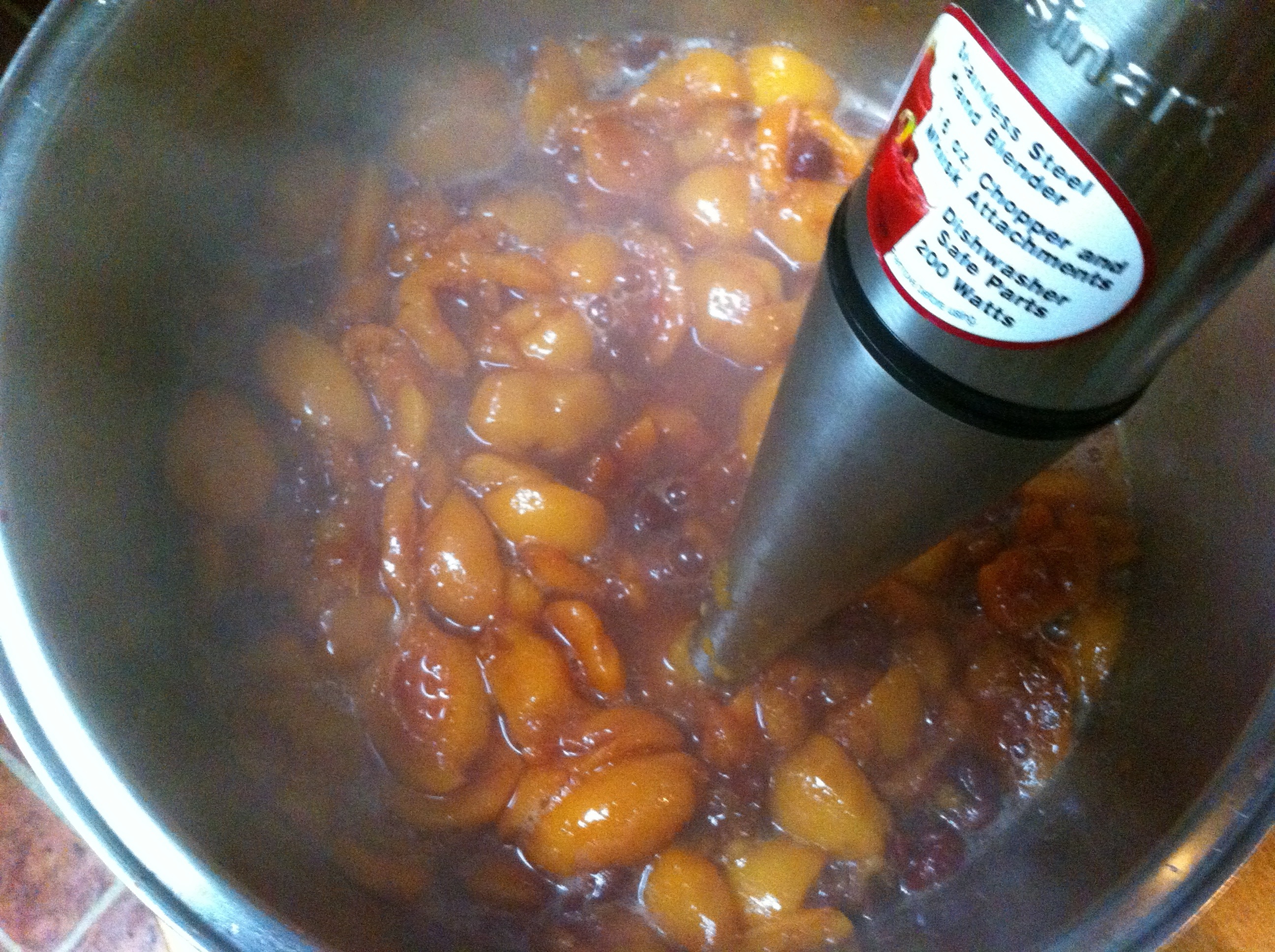 Prepare fruit, if necessary. Like I said, mine came from the freezer so I didn’t do anything else to cut this up any farther because I have an immersion blender that I knew I was going to use. If you don’t want to use an immersion blender, I would cut the peaches up finely.