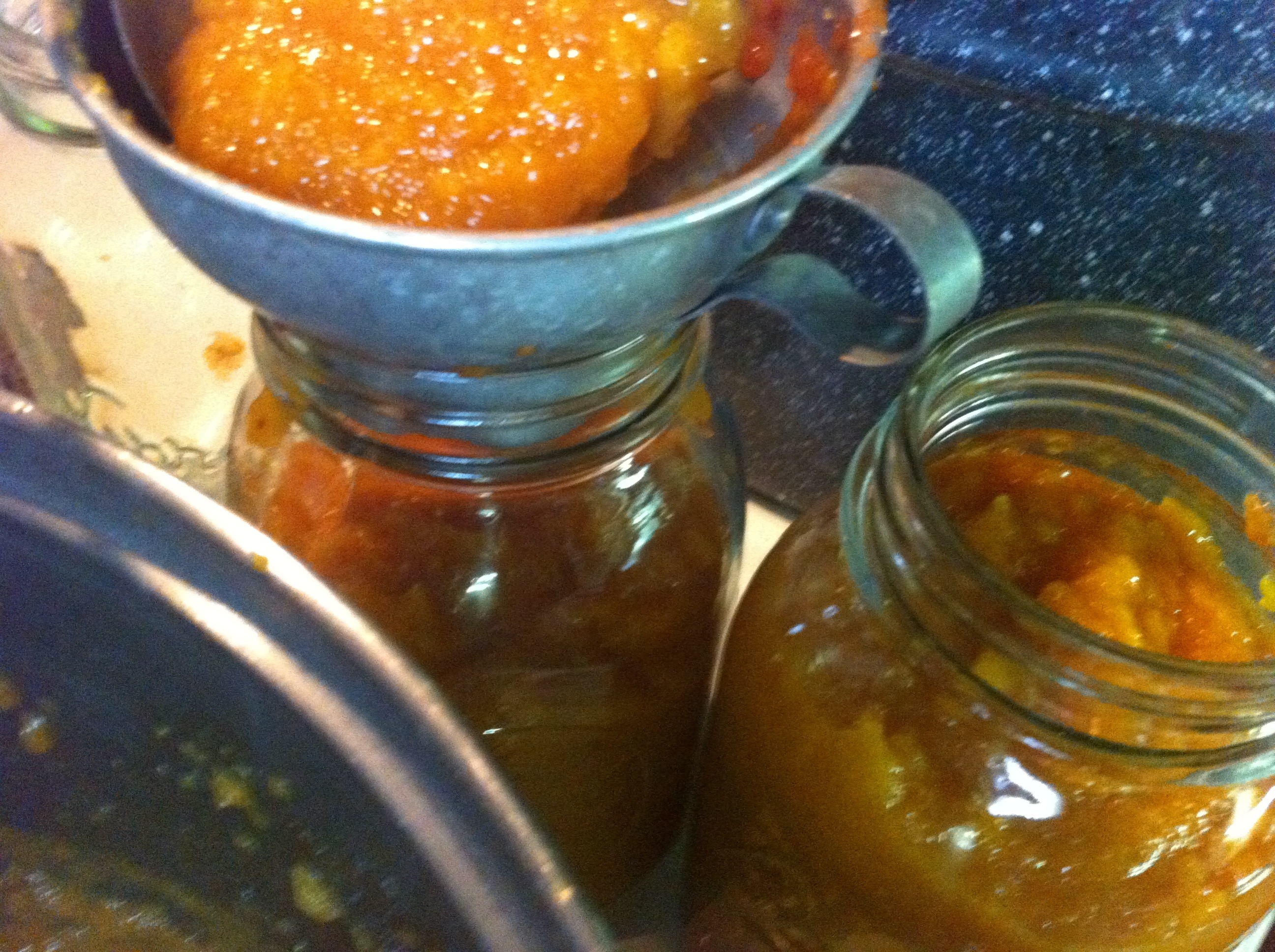 Ladel preserves into hot jars leaving at least 1/4″ headspace…
