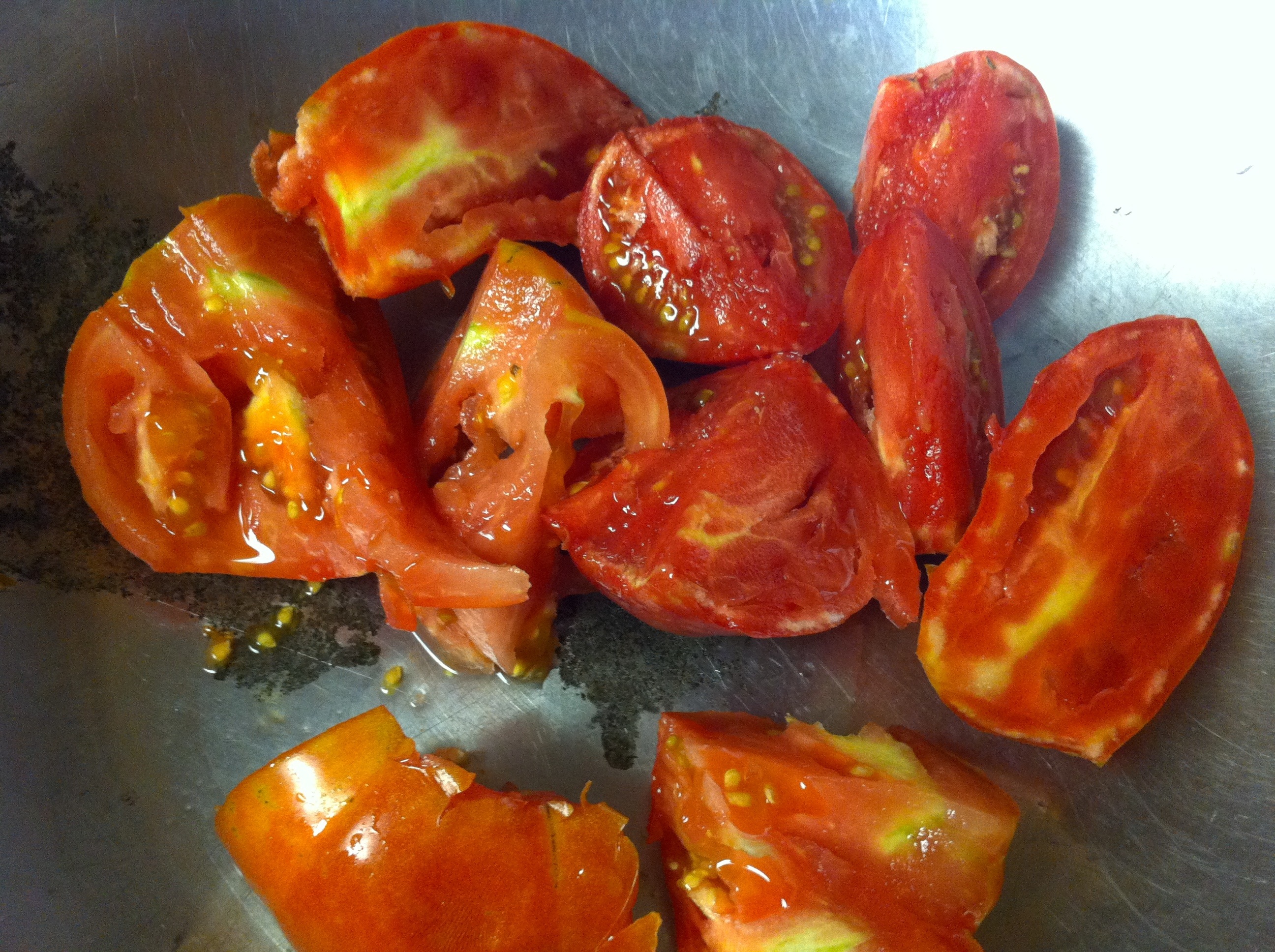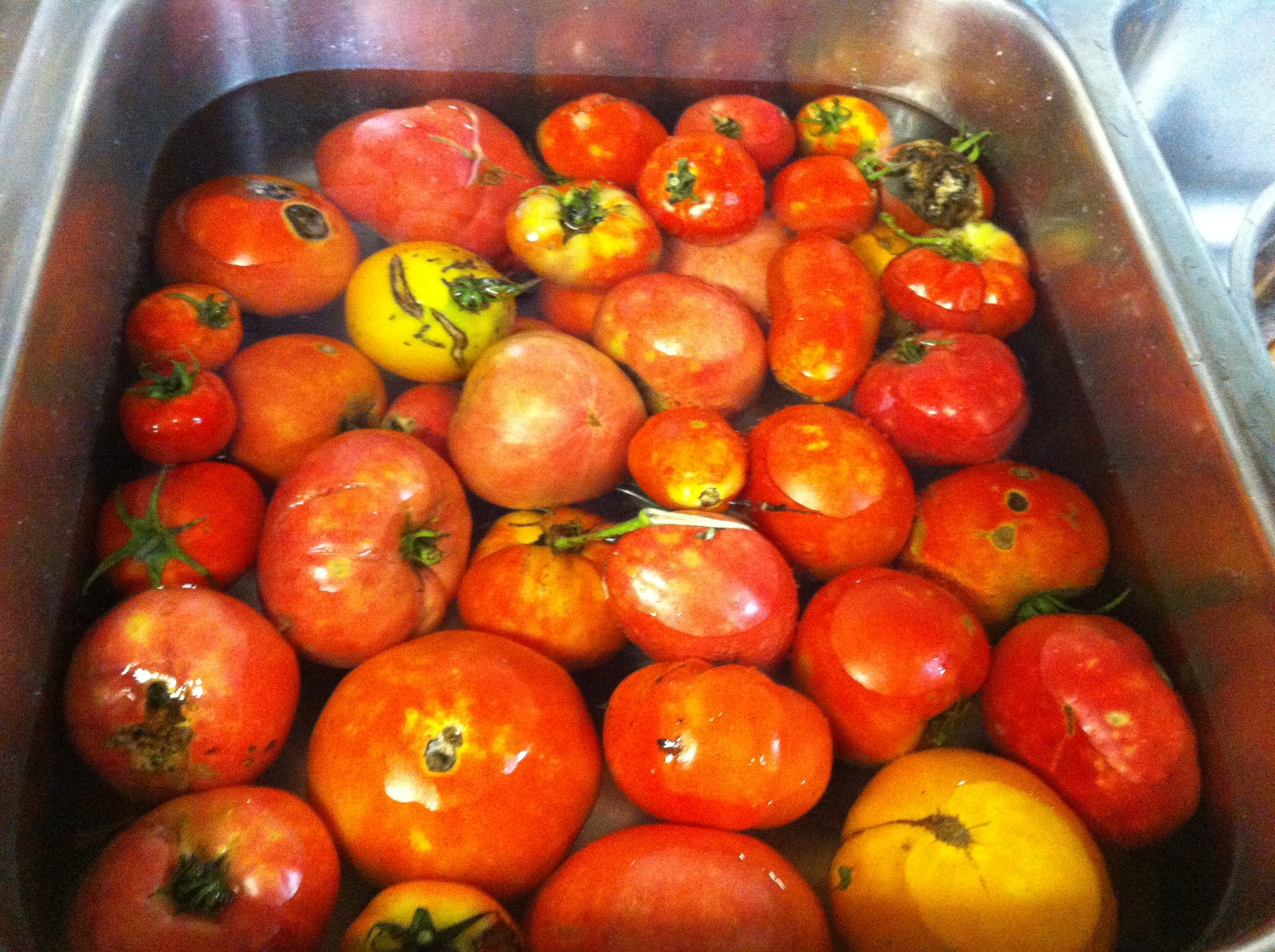 About 45 medium, ripe tomatoes – skins, seeds, cores and bad spots removed {ends up being about 16 cups tomato sauce/juice when most of the liquid is squeezed out before running through the mill or about 20 cups of tomato sauce/juice otherwise}