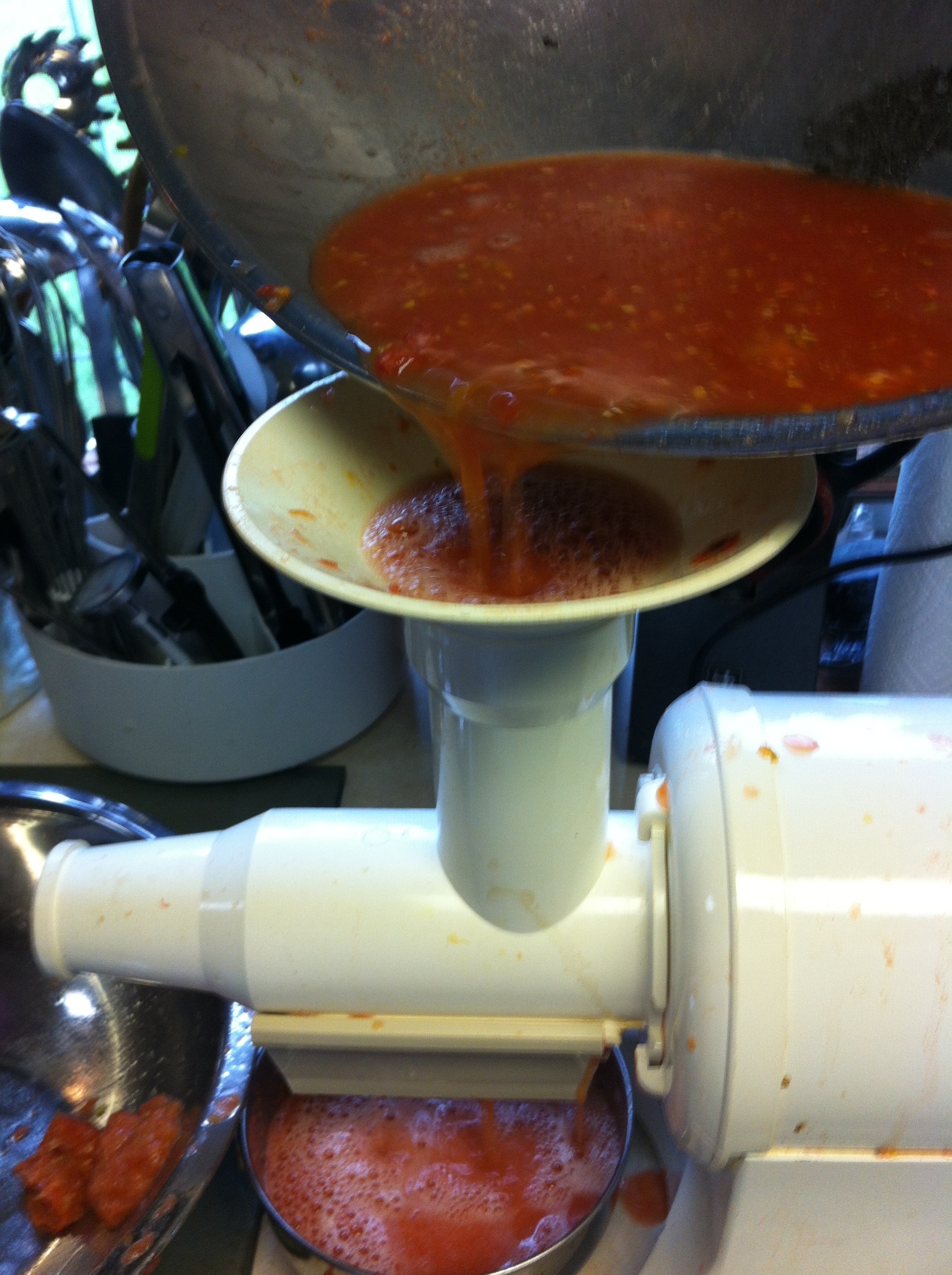 I then squeeze then excess juice out of the tomatoes into the same bowl that I had them in before and run them through the juicer/mill. This helps to avoid having such a runny sauce. If you are using tomatoes like roma, there isn’t as much liquid in them so this wouldn’t be necessary. I didn’t have many roma’s in the mix so out came the excess liquid!