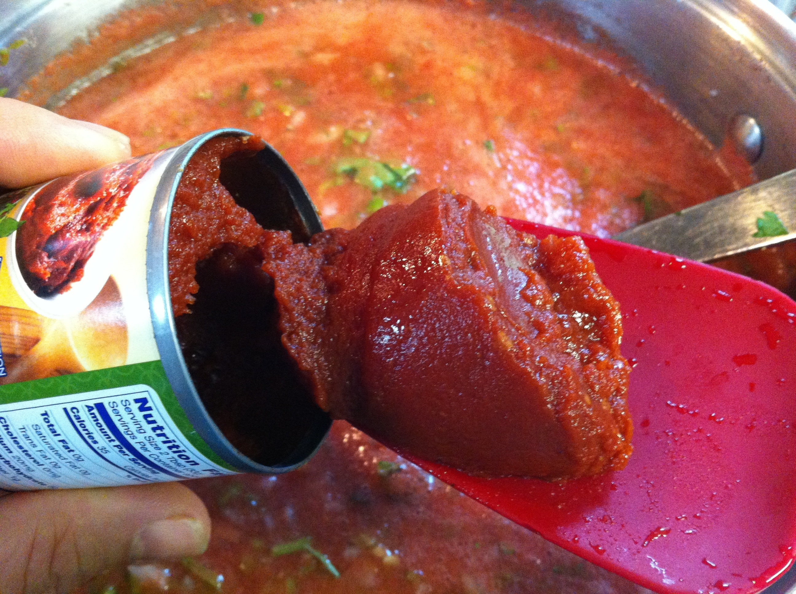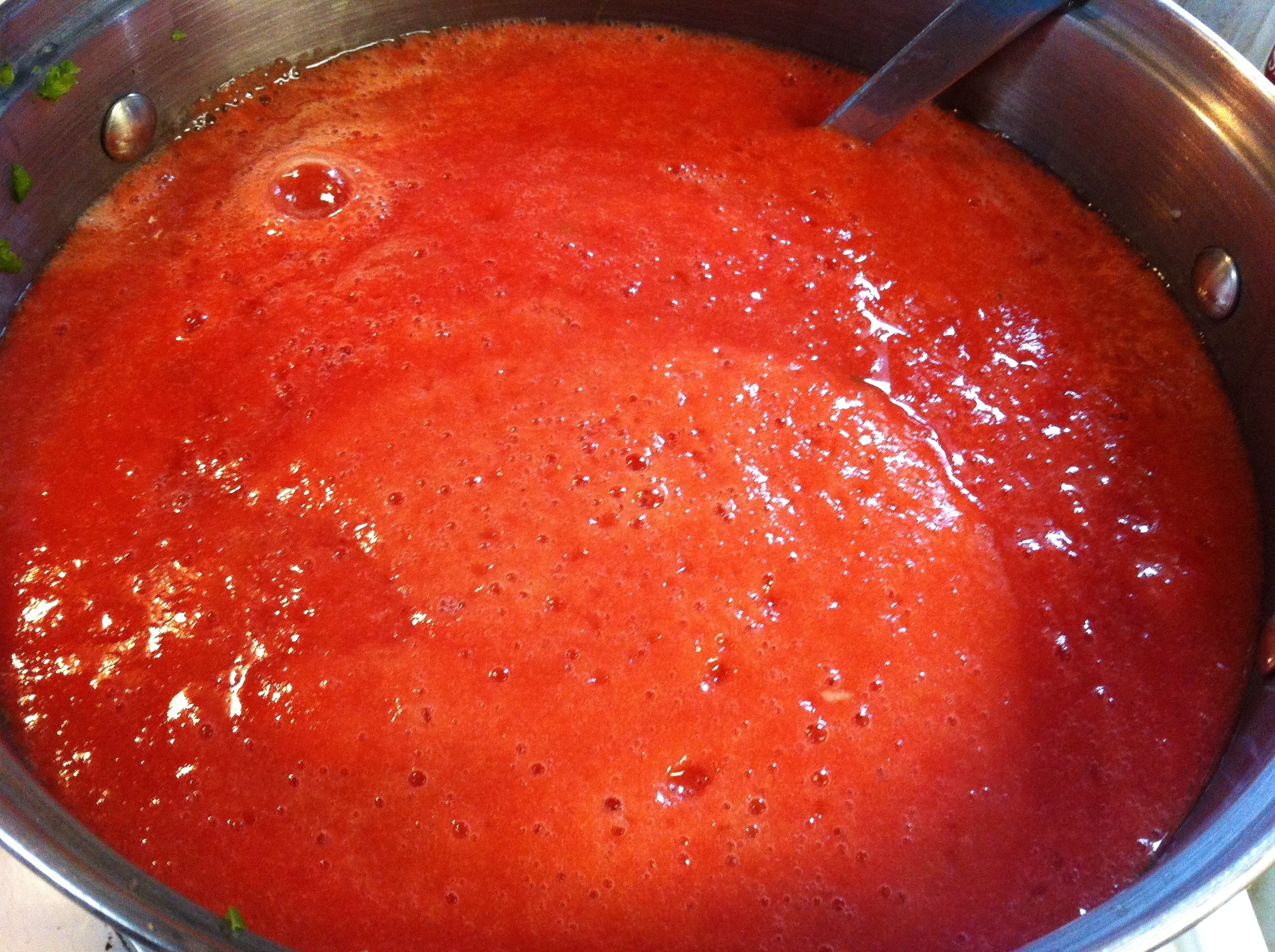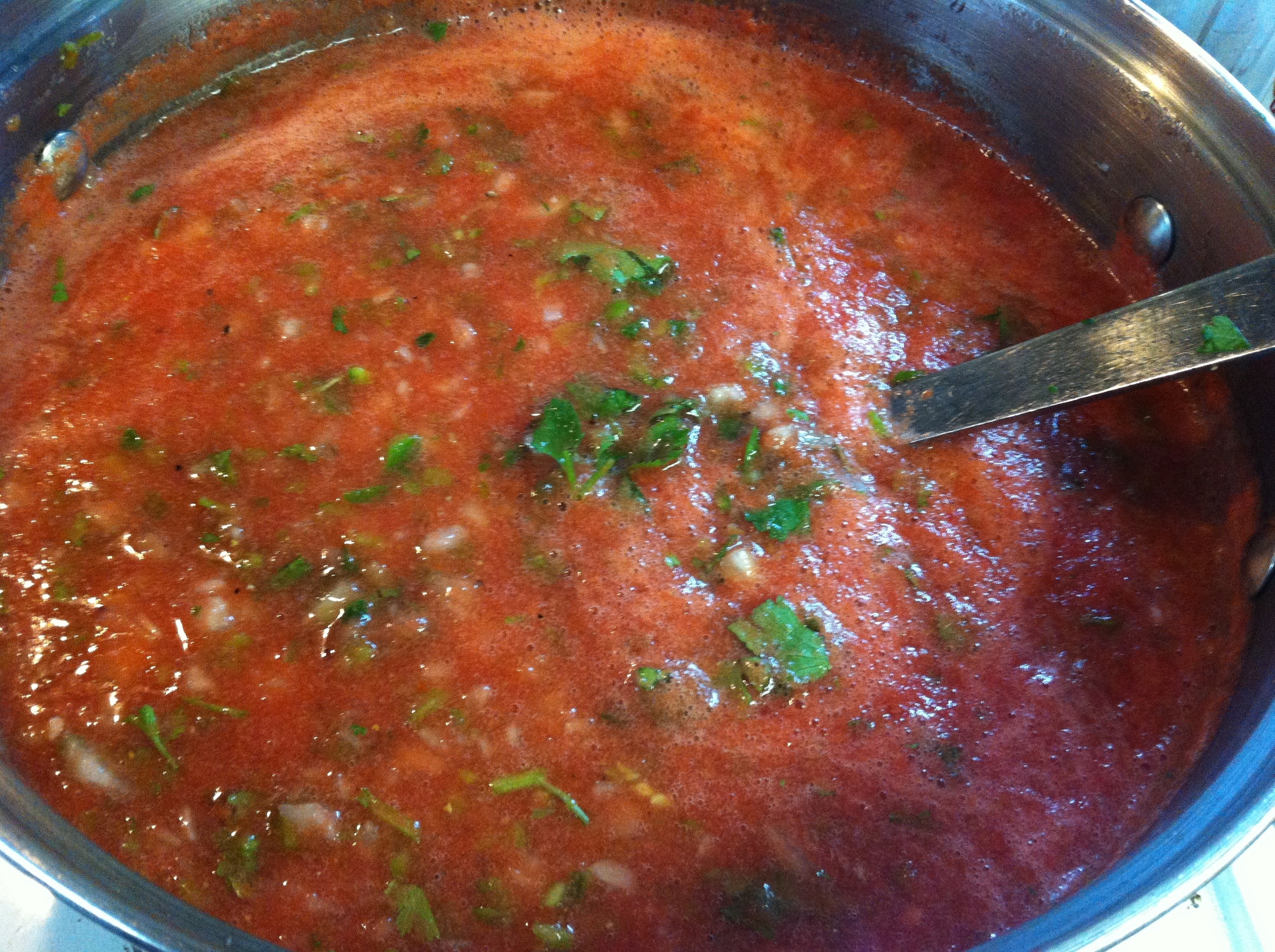 Transfer tomato sauce to the stockpot and stir to combine. Bring to a boil on high heat and simmer for 15 minutes and then add cilantro and simmer another 5 minutes.