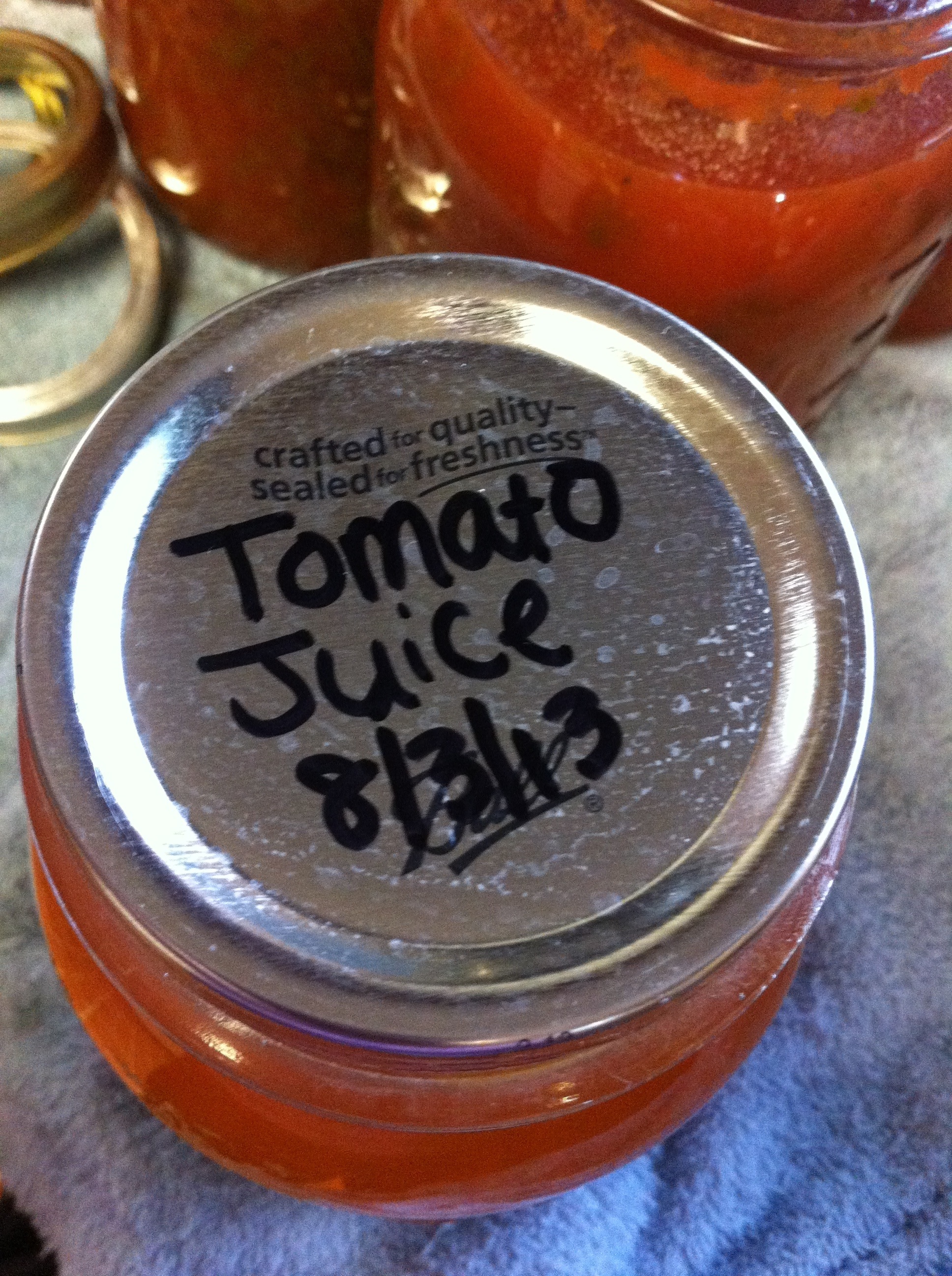 Fill sterilized jars with the tomato juice, 2 T of lemon juice or vinegar per quart {or 1 T/pint}, and 1 t of salt per quart {1/2 t/pint}. Wipe rims and adjust 2 piece cap until *just* finger tight. Process 35 minutes for pints, 45 minutes for quarts in a hot water canner.