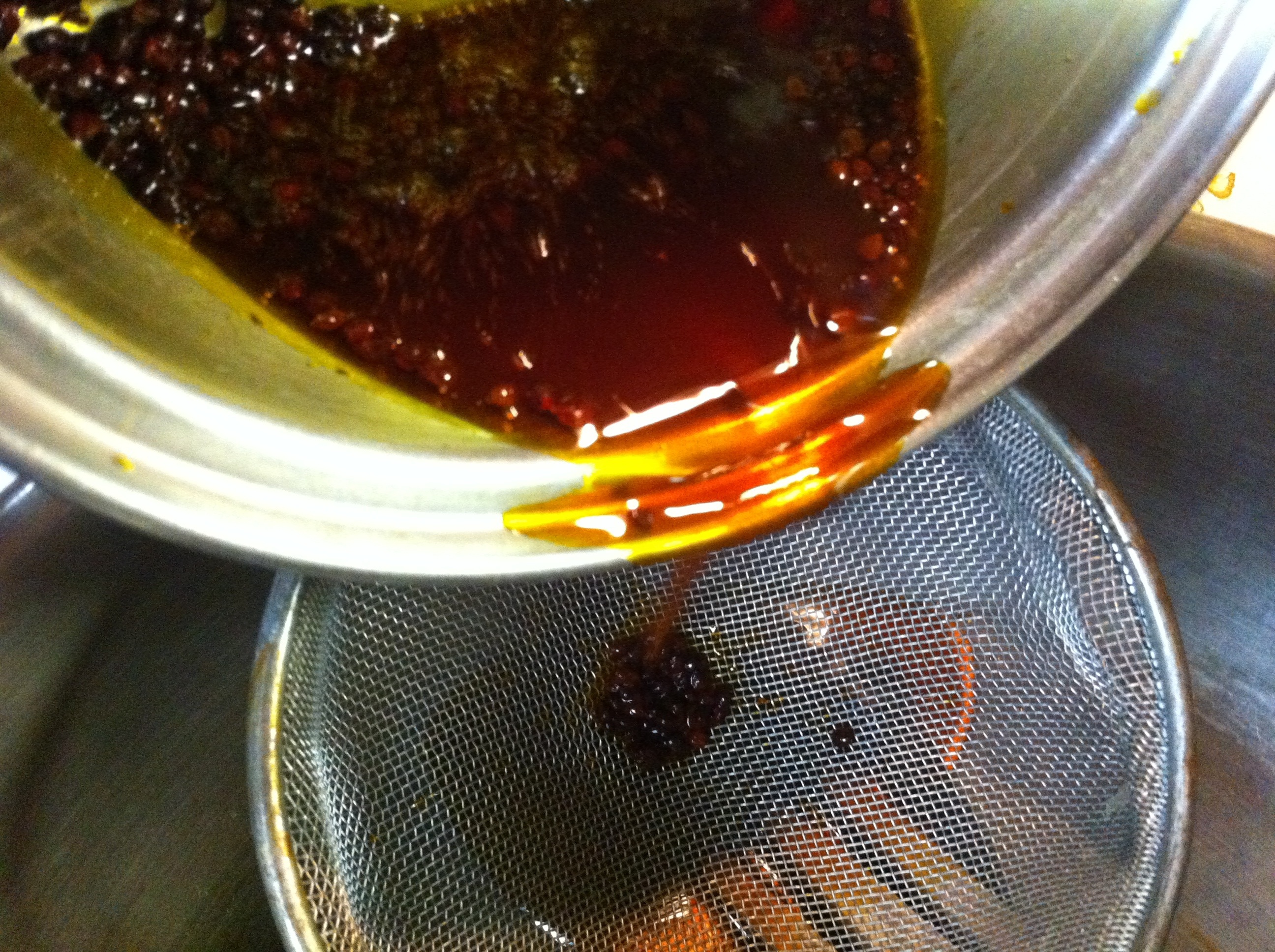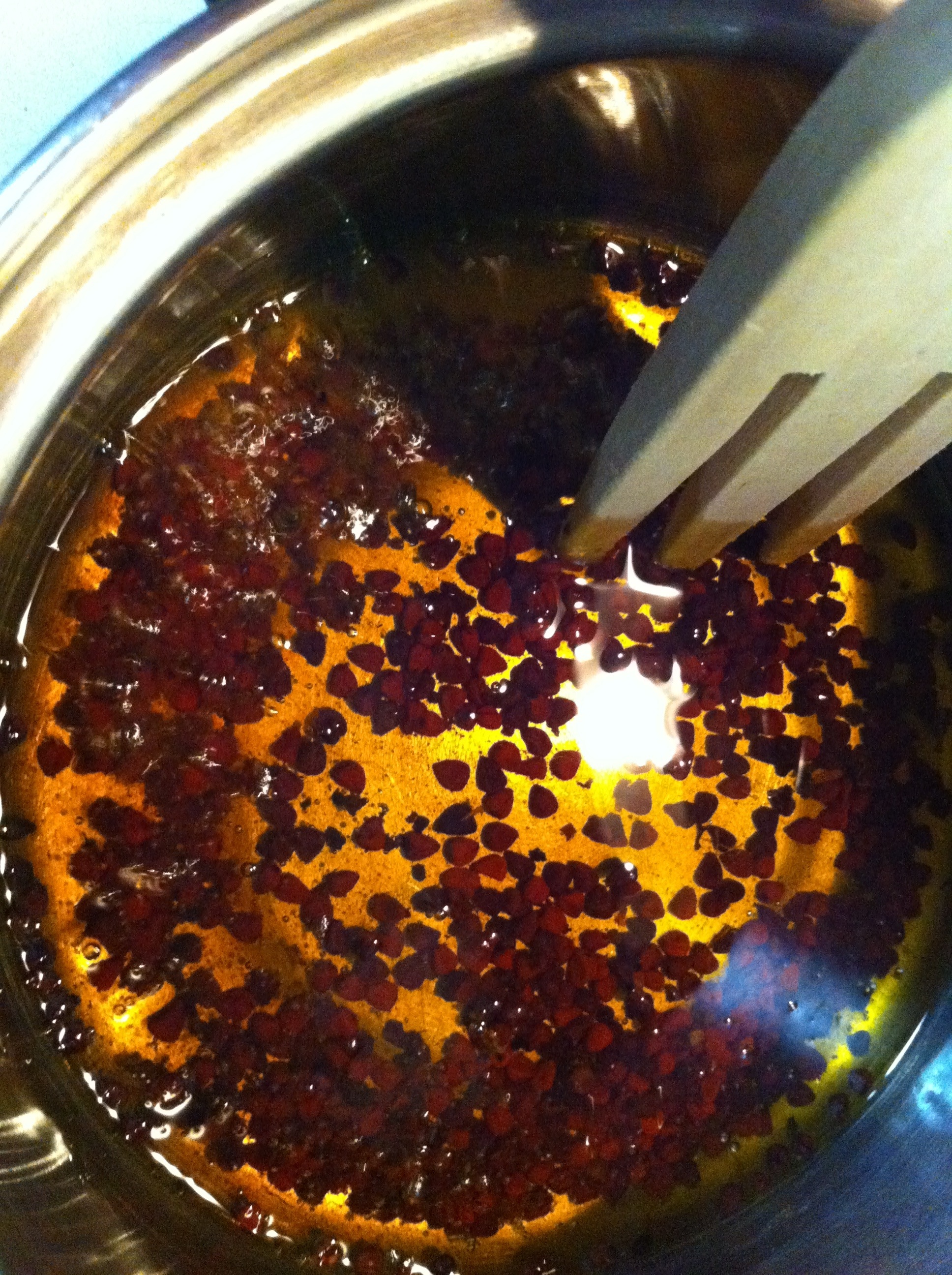 Next pour olive oil into a small saucepan over medium-high heat. Add annatto seeds and stir occasionally with a wooden spoon until annatto seeds start to turn black. Pour oil and seeds through a fine mesh strainer into a large skillet with a heavy bottom. Discard seeds.