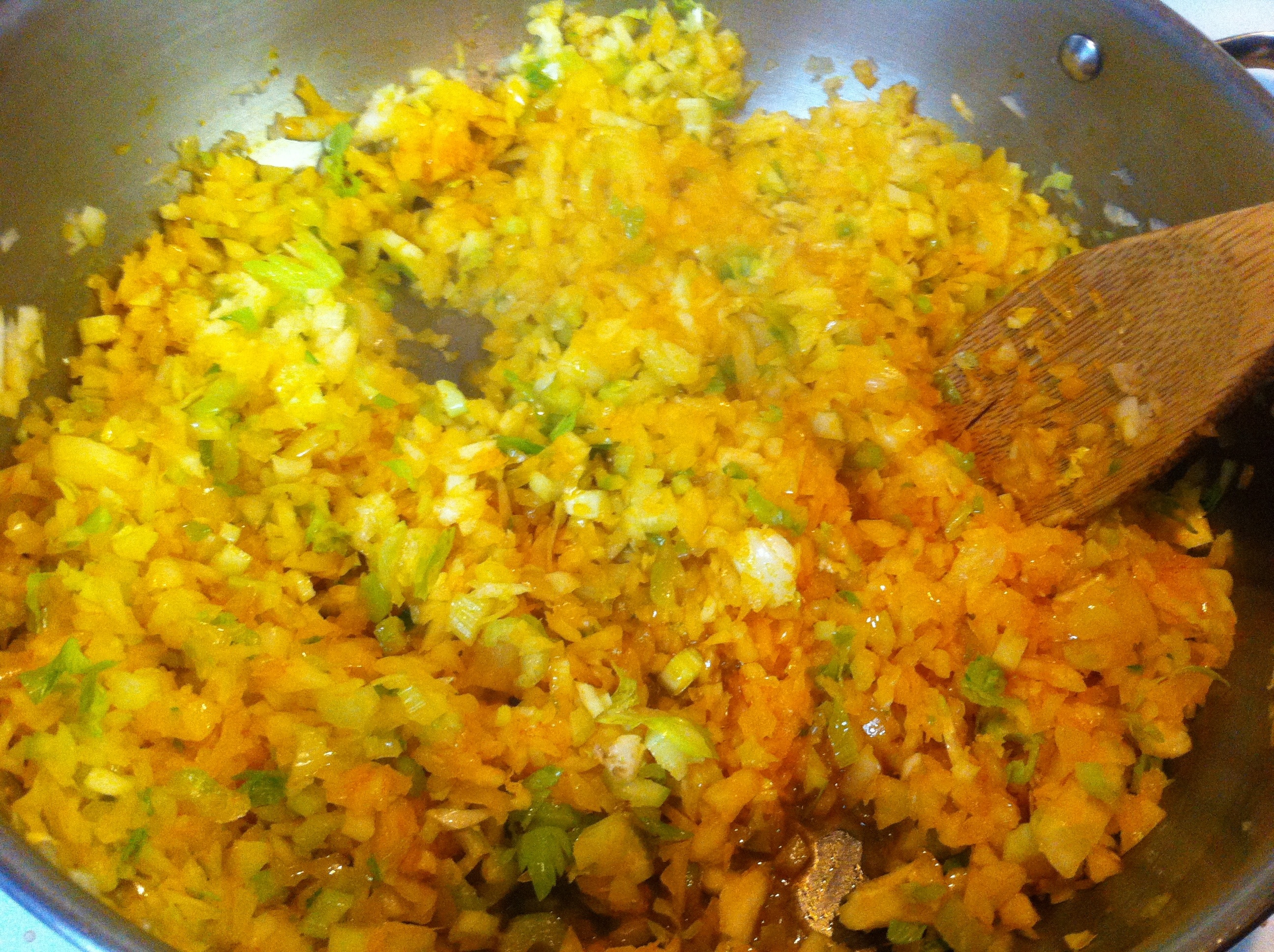 Heat annatto-infused oil over medium-high heat and add chopped onions, garlic and celery. Saute for a few minutes to soften up.