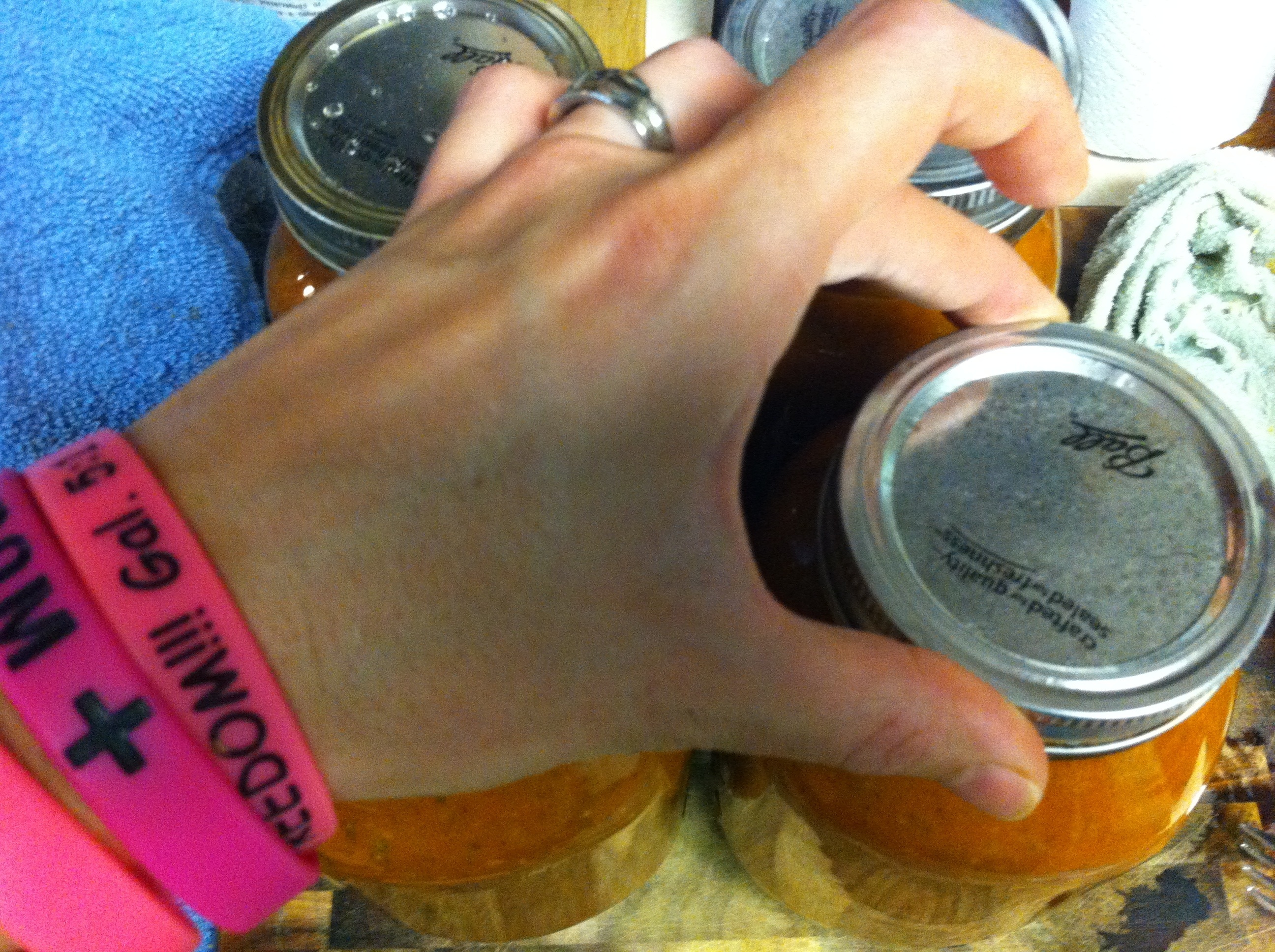 After processing is complete, carefully remove hot jars from canner and place on a towel-lined surface and cover with another towel. Allow to rest 12-24 hours, or until completely cool. Once cool, check to make sure jars have sealed by gently pressing the center of the lid. If it pops back, refrigerate and use. If sealed, label and date and store for later use.