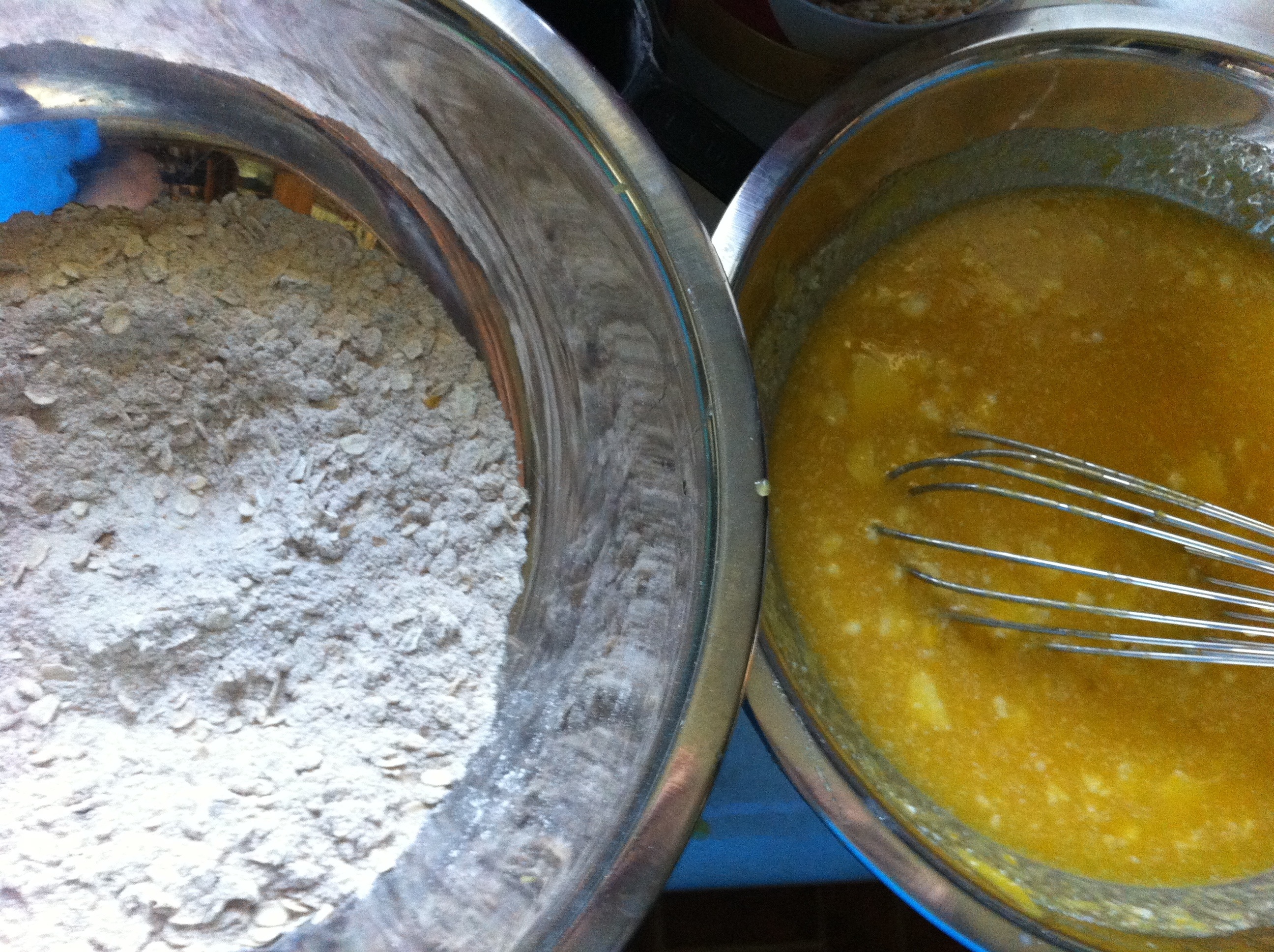 In one mixing bowl combine whole wheat flour, oats, baking powder, pumpkin pie spice and salt. Whisk to combine. In another mixing bowl combine pumpkin puree, brown sugar, eggs, oil and/or applesauce, orange juice and vanilla. Whisk to combine well.