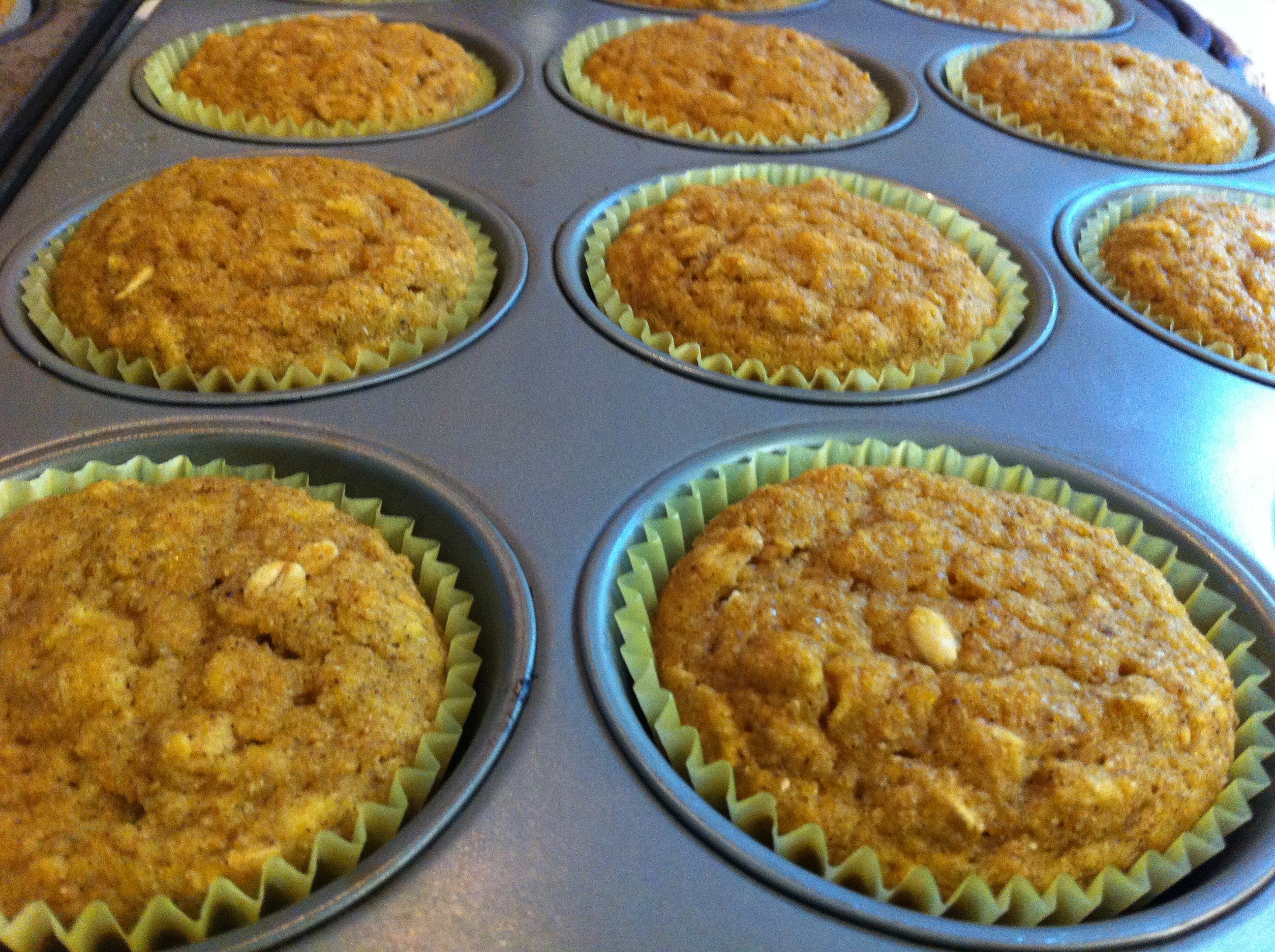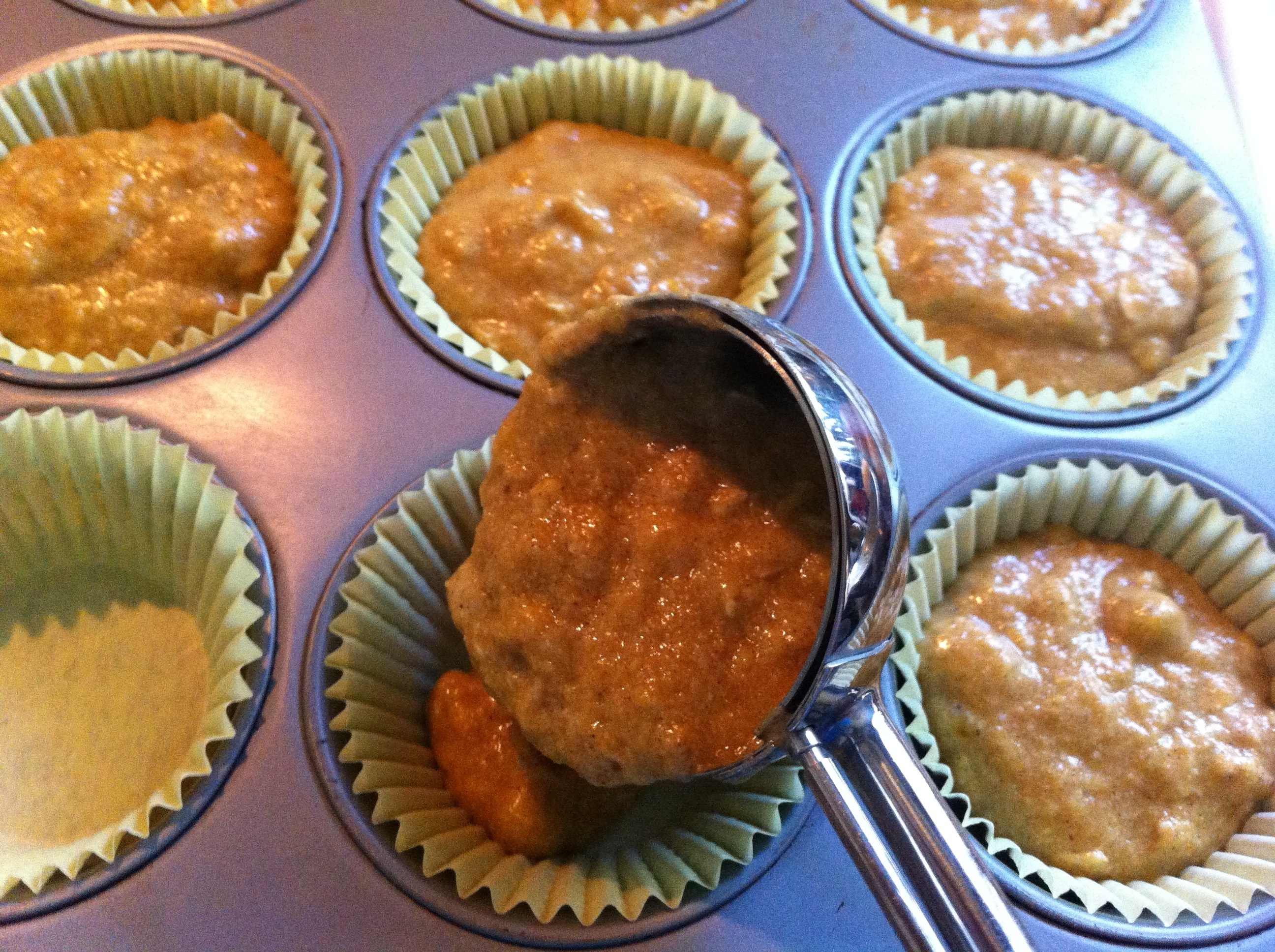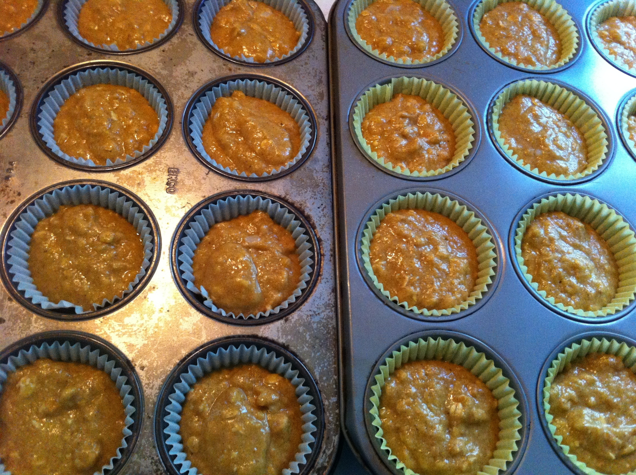 Transfer batter evenly to fill paper-lined or greased muffin tins. Bake in a 375 degree oven for 18-20 minutes, or until toothpick inserted in center comes out clean.
