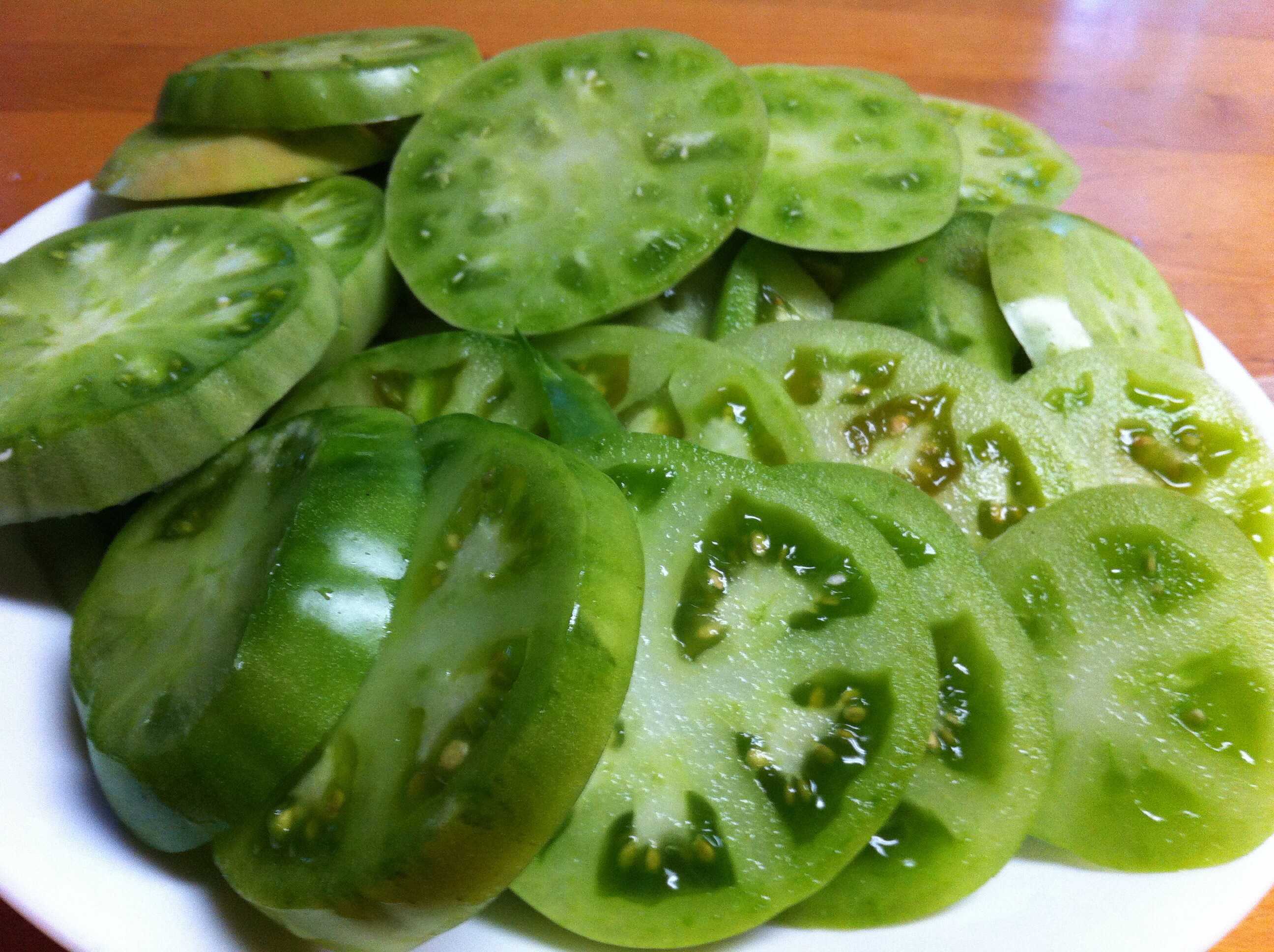 I know that it is the beginning of November right now, and I debated on whether or not I should make a post about these fried green tomatoes now, or wait until early next summer when people have plenty of green tomatoes before they start to ripen up with the heat. You see, we did a tomato and pepper rescue a couple of weeks ago when out of nowhere it started to snow ALL DAY here in our part of Kansas! Granted, I know that most people in the Midwest still aren’t actively harvesting tomatoes in mid/late October, but I figured if we had a plethora of these green guys to be used up surely someone else out there has a bounty they would like to use up in some way as well…so that factor made my decision for me. So, here you go…read on and if you are one of the lucky ones to have these green globes right now, fry some of them up and enjoy! -Shelley