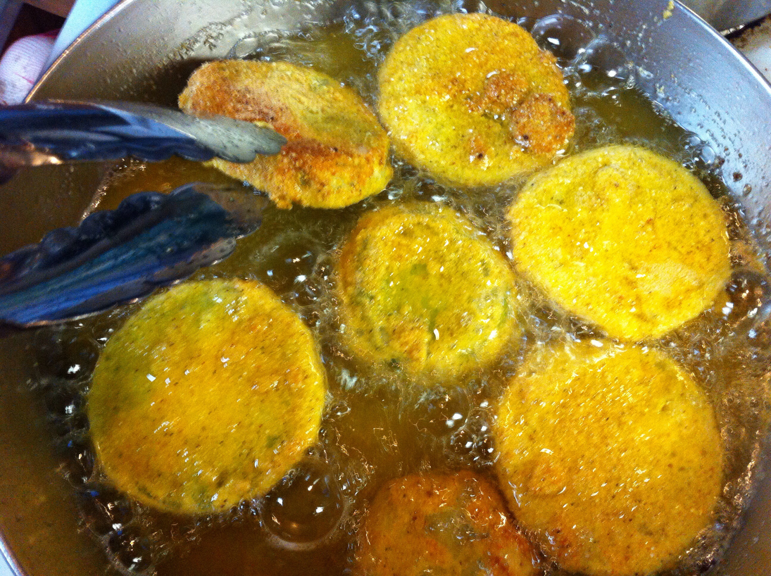 Place in hot oil and repeat process until pan is filled. Cook until golden and crispy on one side, flip and cook until golden and crispy on the 2nd side.
