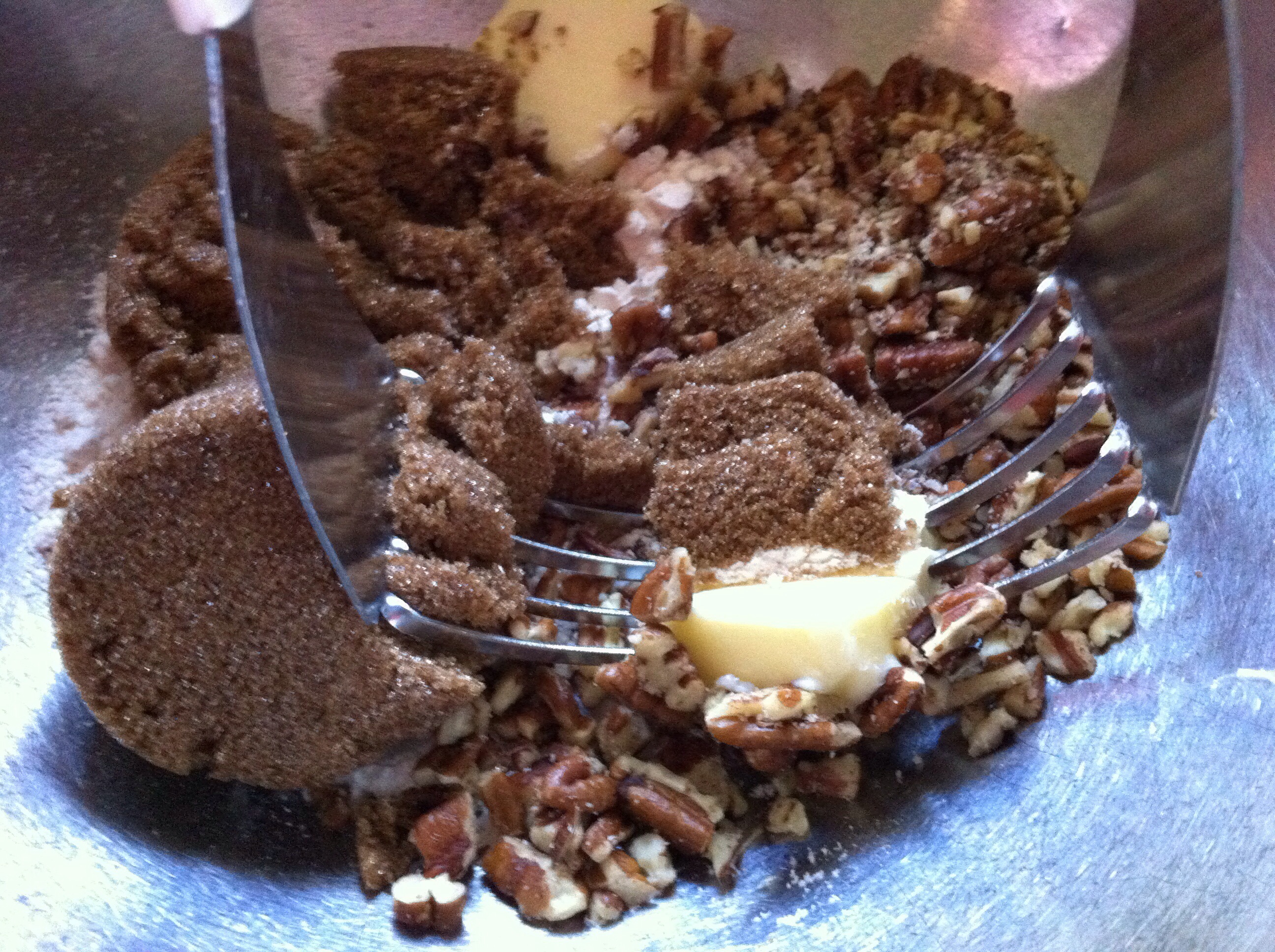 In a separate mixing bowl add brown sugar, pecans, flour and cold butter. Using a pastry cutter {or a fork} cut butter into the mixture and make sure everything is well combined.