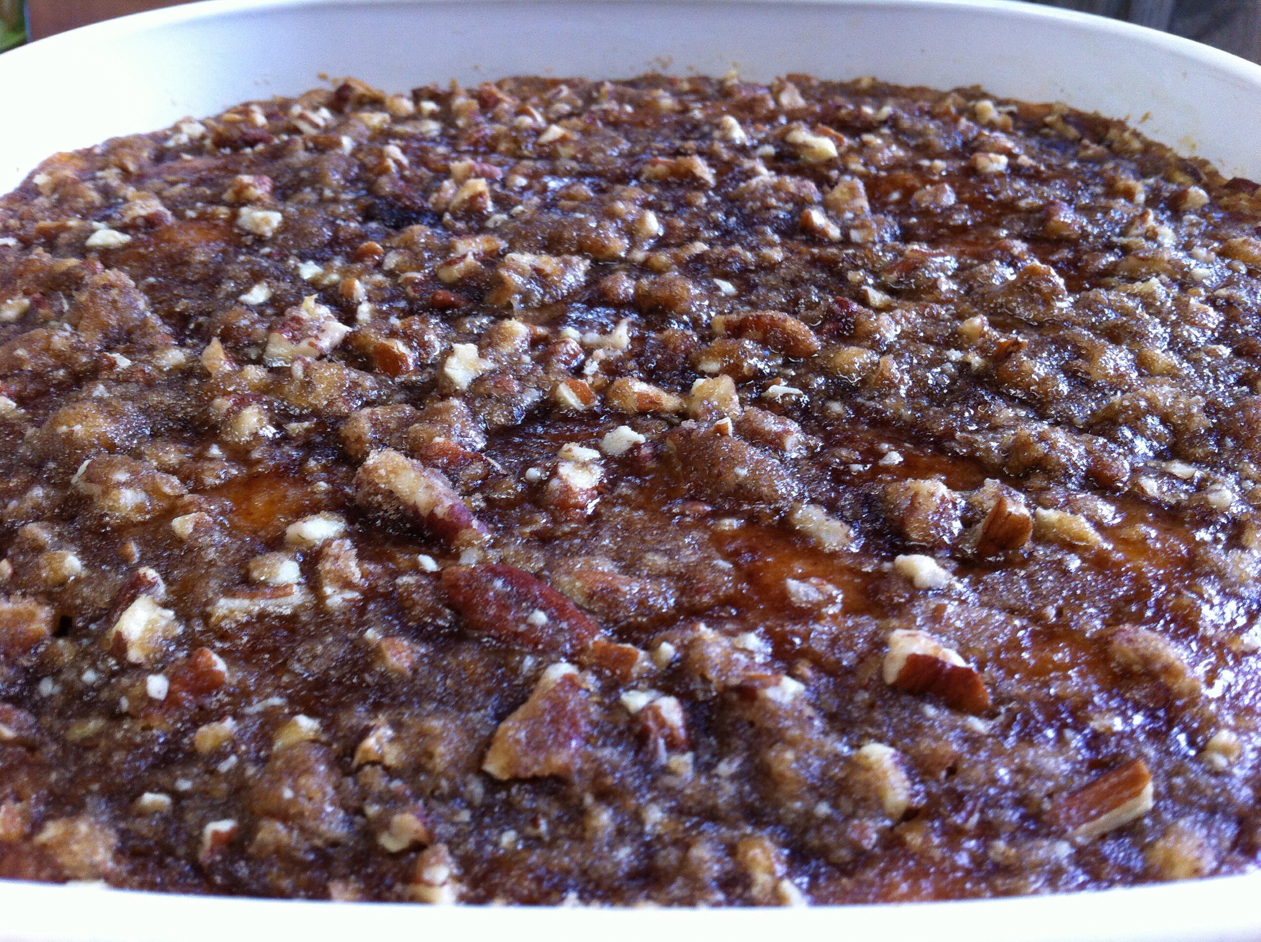Evenly sprinkle pecan topping over the sweet potatoes.