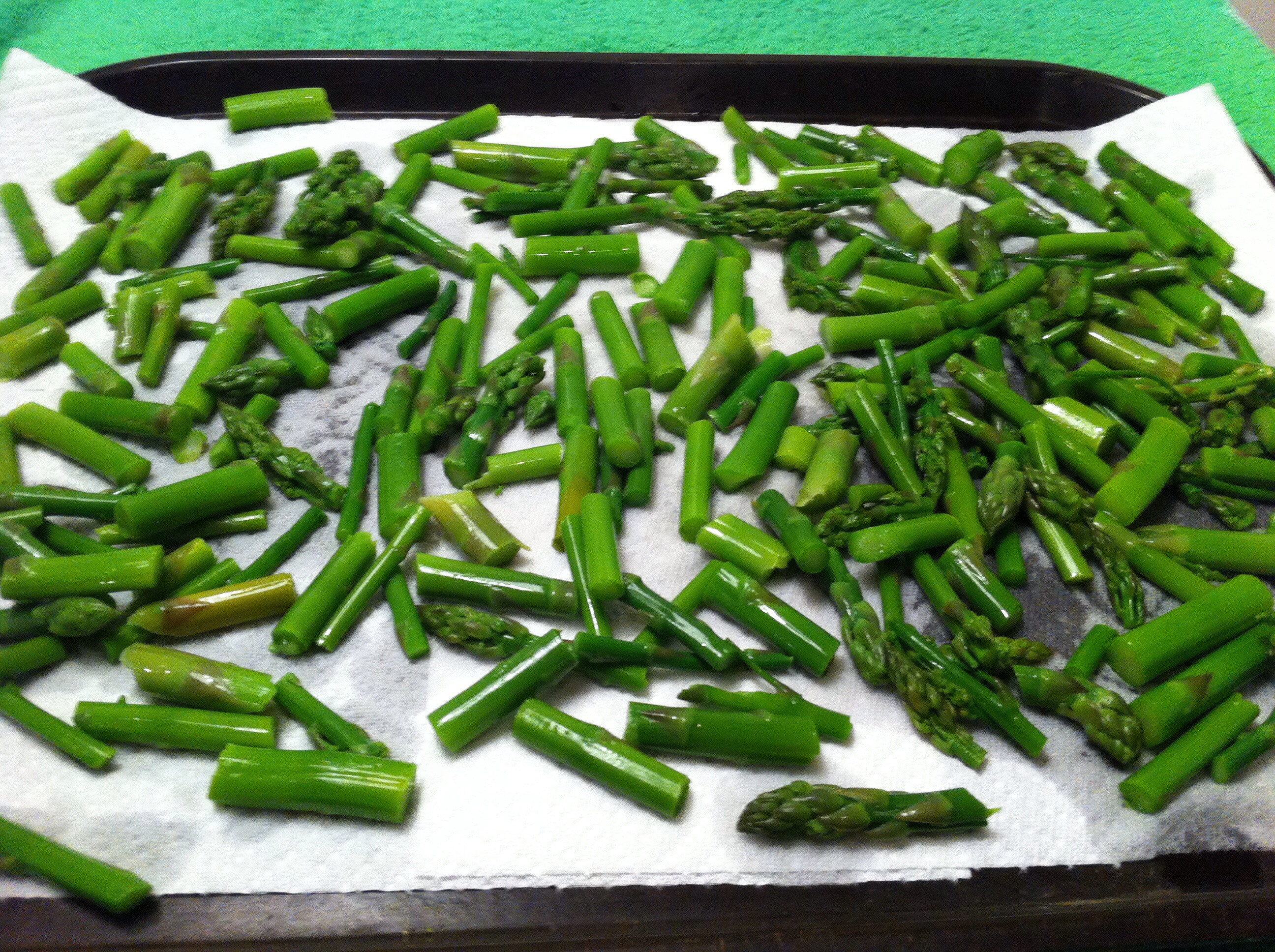 **As a side note, a good way to keep asparagus fresh until it is ready to be used is to place the cut side of the asparagus in a clean glass of water and be placed in the fridge. The water should be changed every day or two otherwise it can get quite stinky, which is certainly not desirable!**