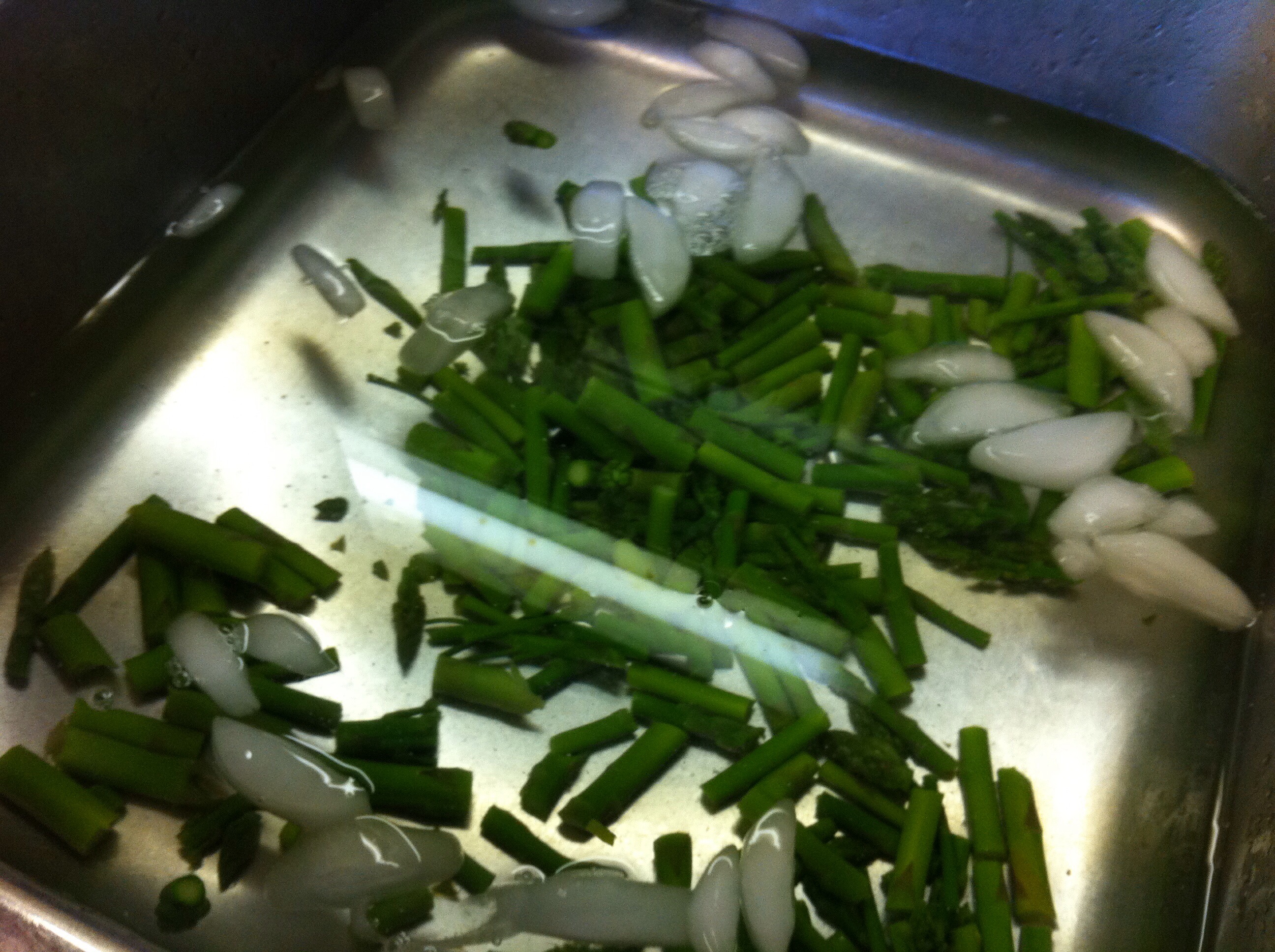 At the end of the 2-3 minutes, place blanched asparagus in the ice-water and leave for approximately the same amount of time that it took to blanch.