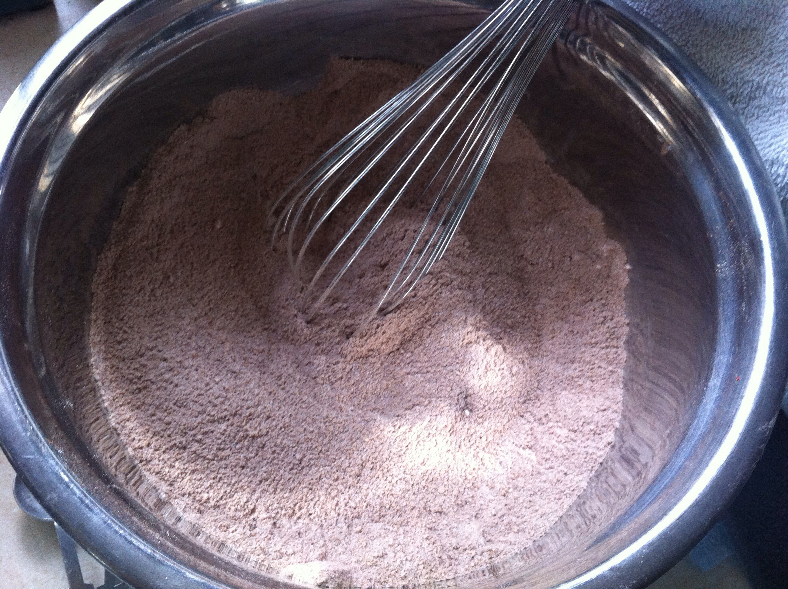 In a large mixing bowl combine whole wheat white flour, sugar, cocoa powder, cinnamon, baking powder, baking soda, and salt. Whisk well to combine.