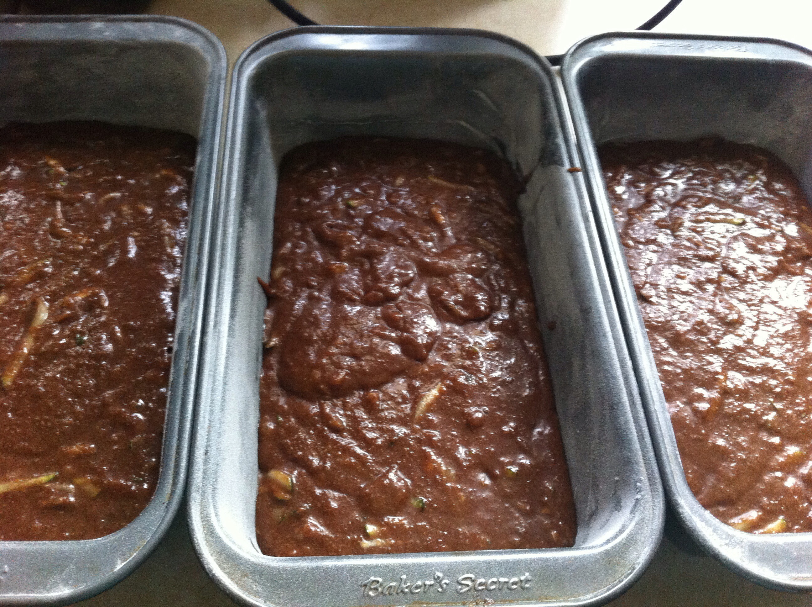 One of the things I love about summer are all of the fresh vegetables that we are able to grow, pick, and then eat up! Our zucchini plants look excellent this year and we’ve been chowin’ down on everything from grilled zucchini, stir-fried zucchini, sautéed zucchini, to zucchini bread. My family loves zucchini bread, but today I made something that I have never made before – CHOCOLATE zucchini bread – and boy is it good! I was at a friend’s house the other day and she had made this bread with her grandson and allowed us a taste test and I loved it! She gladly shared her recipe, which I adapted a bit by using whole wheat flour and an applesauce/butter combination instead of the vegetable oil that it called for. She also added raisins and chocolate chips to her bread, which I chose to forego this round. The basics are still the same though, and I was very happy with the results!
