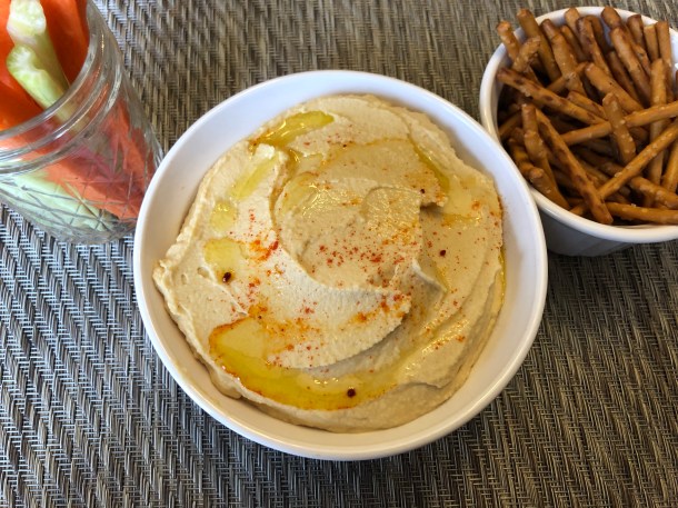 Today’s hummus recipe includes: chic peas, cumin, garlic, salt, lemon juice, and tahini. It has a bit of olive oil drizzled on and smoked paprika sprinkled on at the very end. So good.