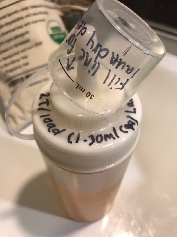 The verdict is still out on my thought process regarding the kids’ rationing out the golden liquid for each load, because even though I’ve told them repeatedly they ONLY need to use 2-3 tablespoons per load (and I have a NyQuil measuring cap with an arrow pointing to the fill line), the detergent seems to be getting used up a bit faster than what I was anticipating. The cleaning power seems to be working well though!